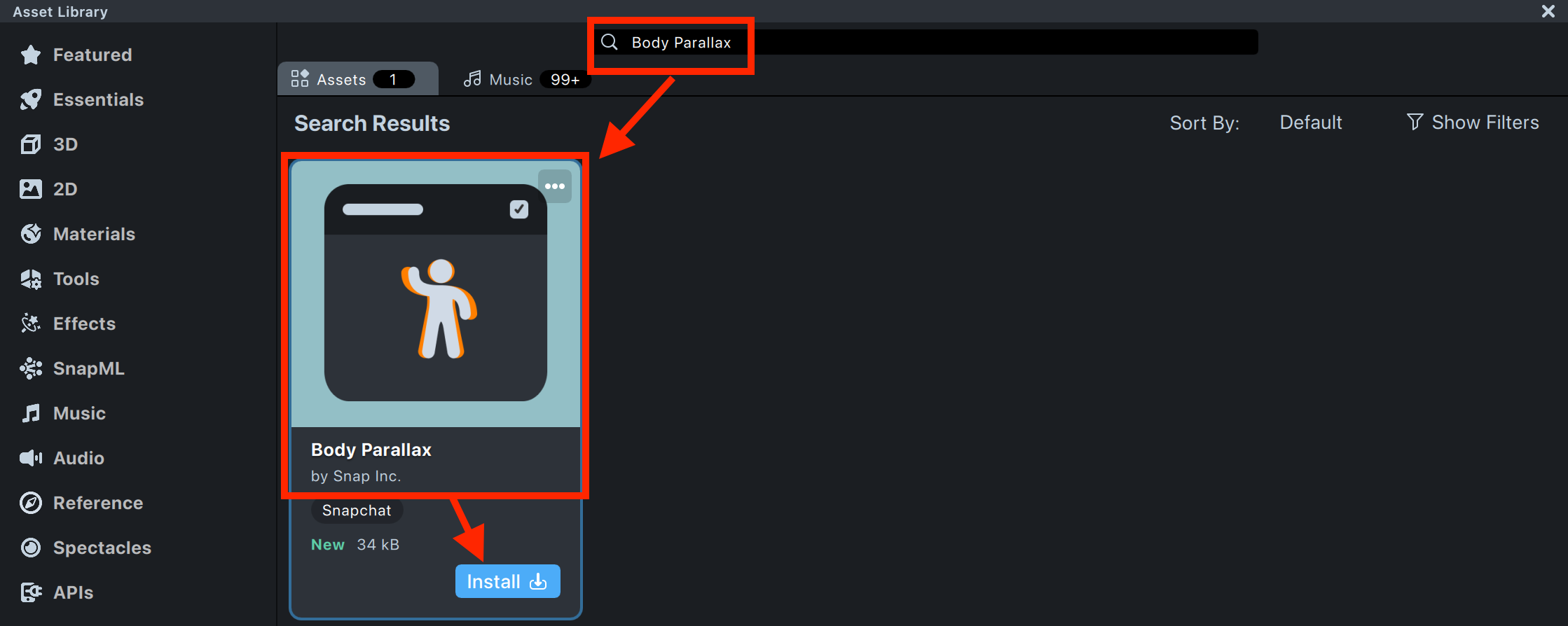 6.1. To make the generated AI Portraits output more engaging, add a Body Parallax effect to create a sense of depth and motion. Open the Asset Library, search for Body Parallax component, and click Install. The component will appear in both the Asset Browser and the Scene Hierarchy.