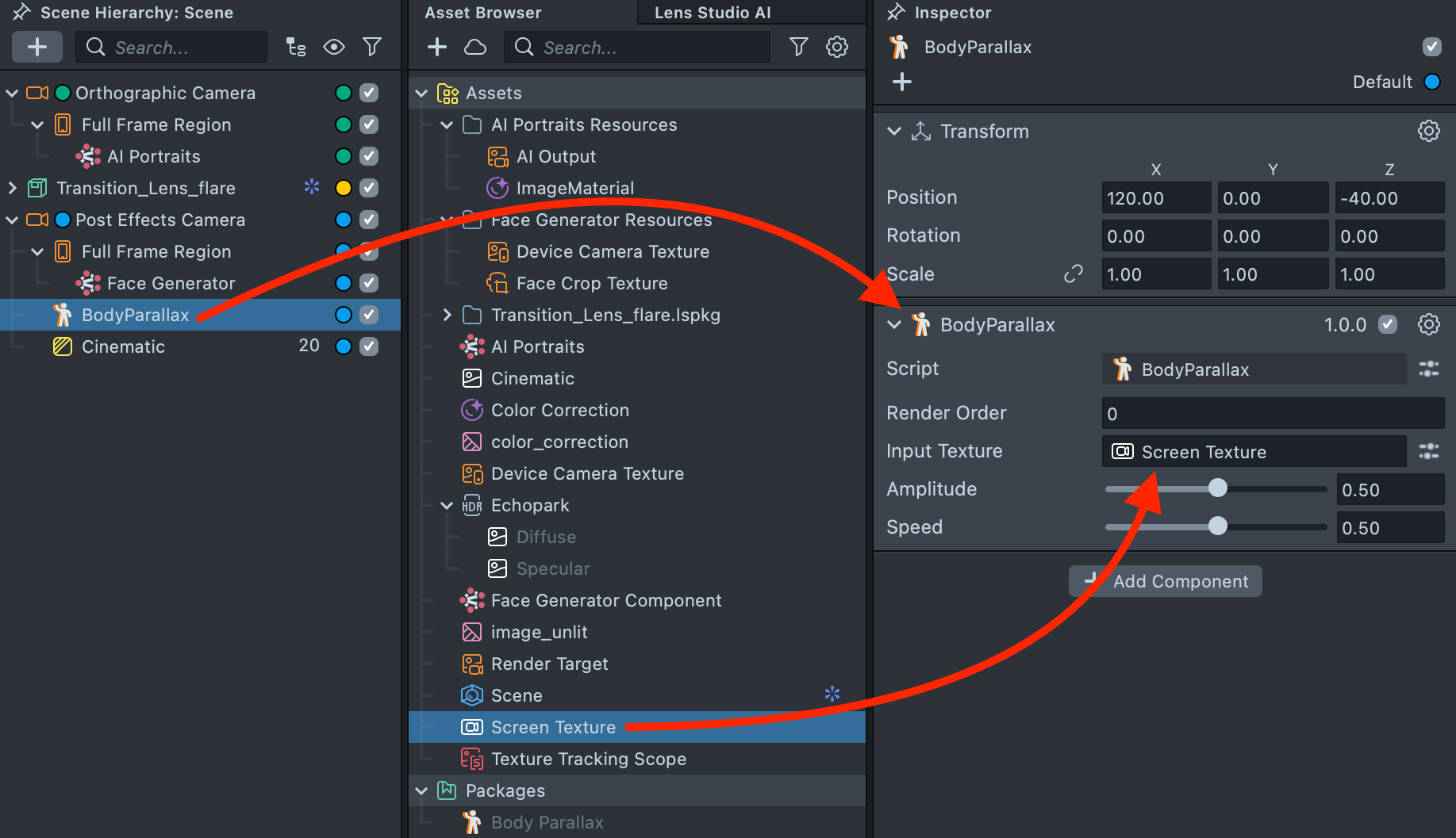 6.4. In the Scene Hierarchy, select Body Parallax and set Screen Texture as the Input Texture in the Inspector.