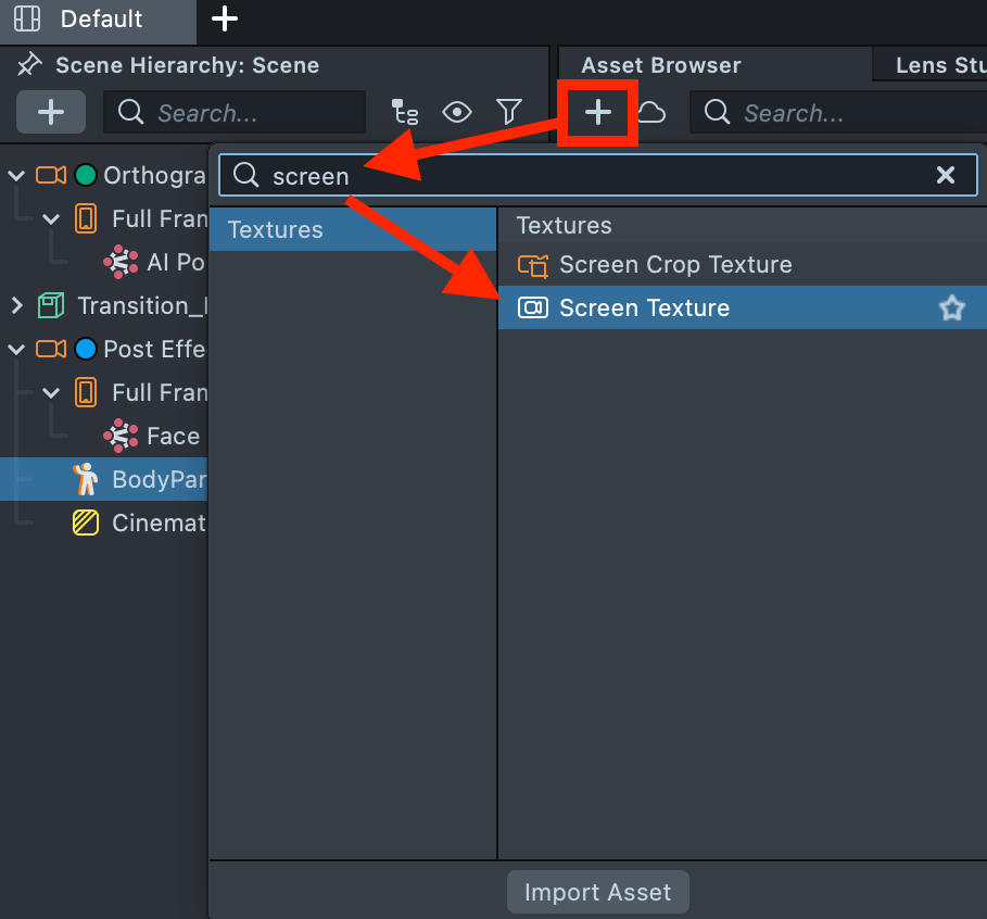 6.3. Add the Screen Texture by clicking the + button in the Asset Browser.