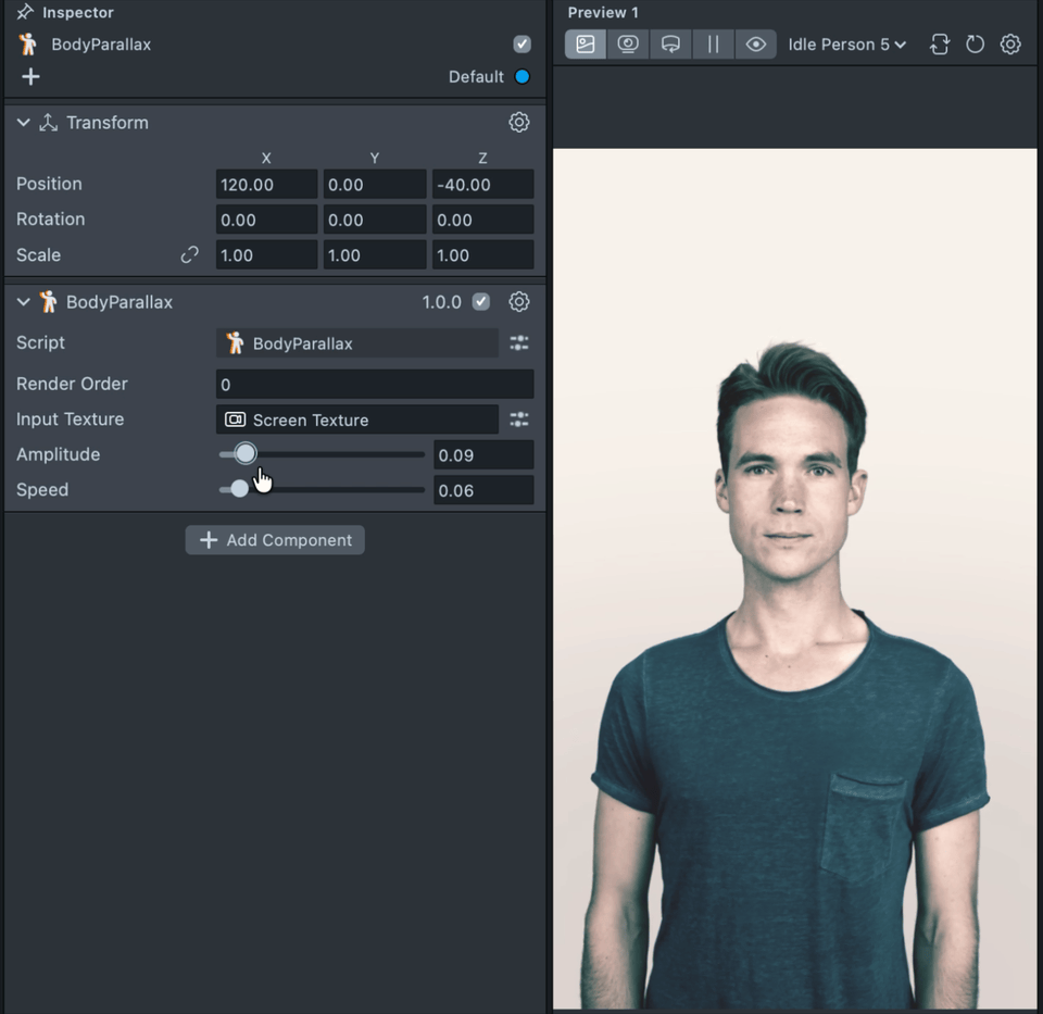 6.5. To preview the Body Parallax effect, temporarily disable the AI Portraits component and the transition, as they may interfere with the post-effects setup. You can then adjust the Speed and Amplitude sliders to control the intensity of the effect and observe the changes in the Preview panel. Be sure to re-enable the disabled components once you have finished adjusting the Body Parallax settings.