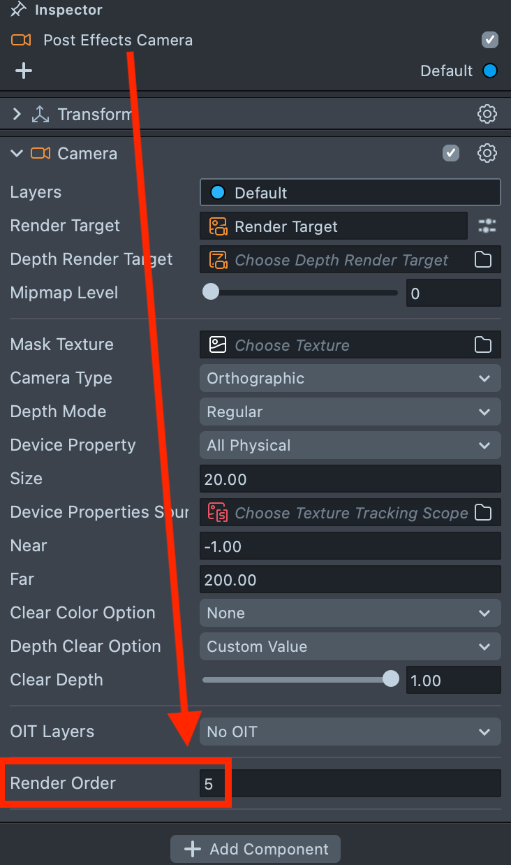 3.4. Set the Render Order of the Post Effects Camera higher than the previously added cameras to see the final result.