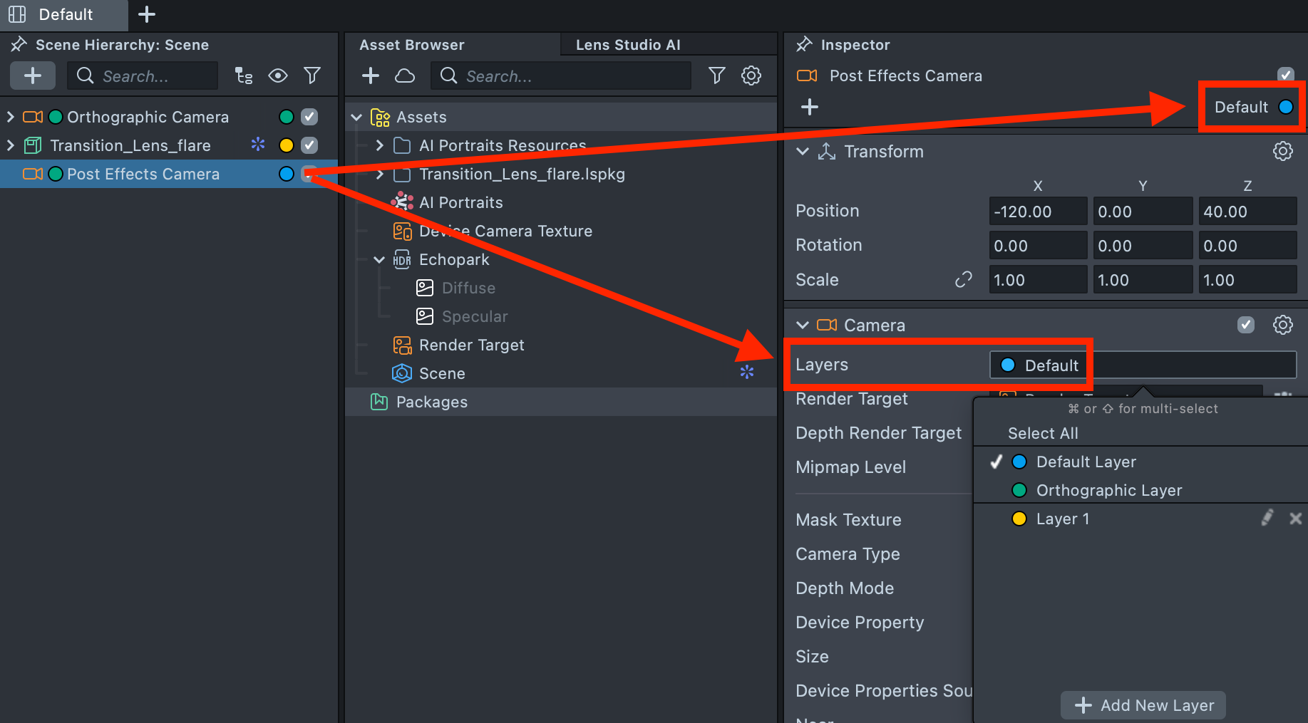 3.3. Assign the Default Render Layer to Post Effects Camera. Note that the layer must be assigned in two places: in the top-right dropdown and in the Layers field.