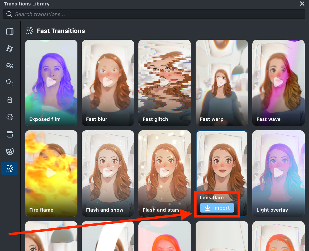 2.2. Open the Transitions Library and choose a transition. Import it into your project by clicking the Import button. The transition components are automatically added to your project.