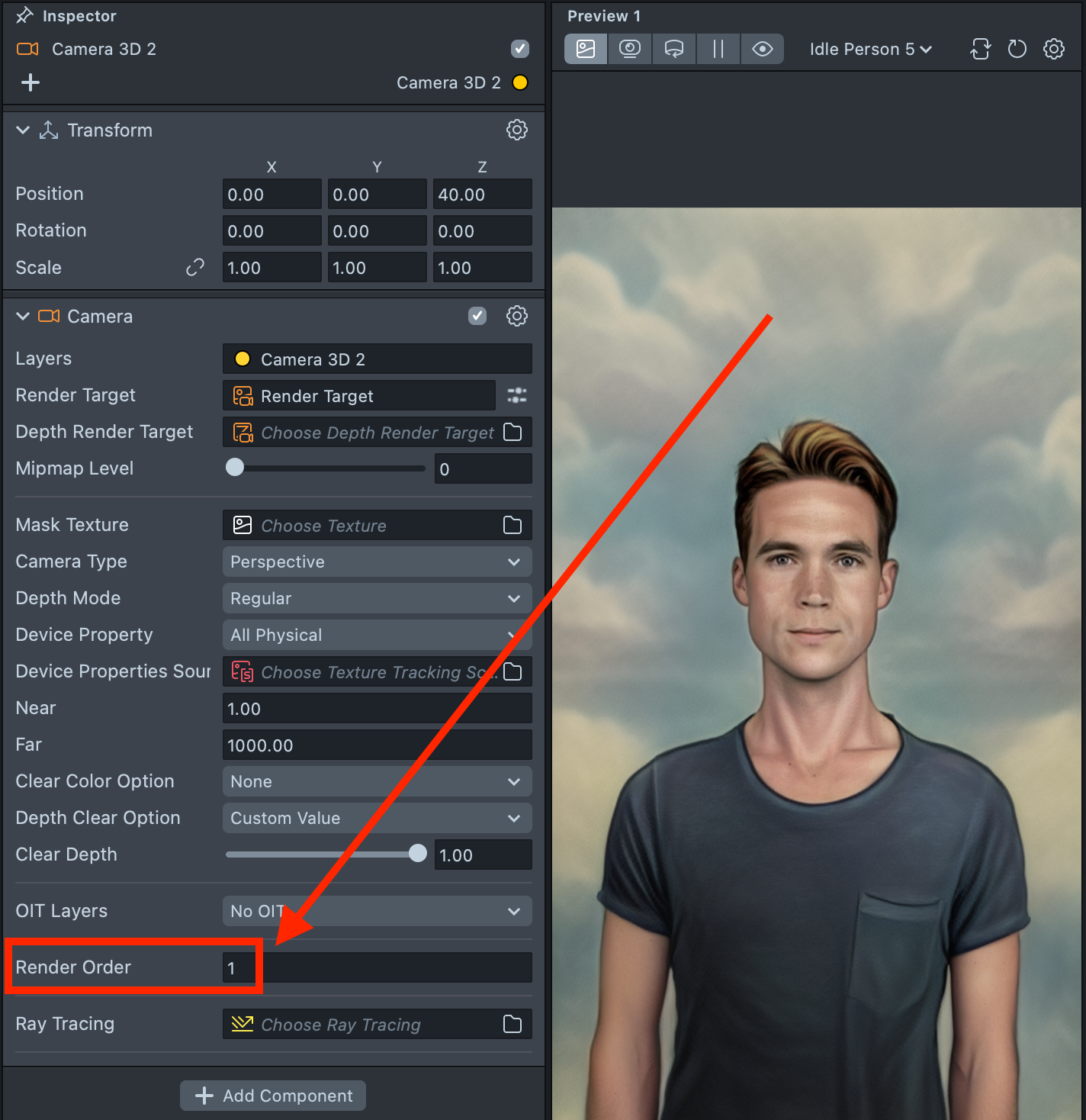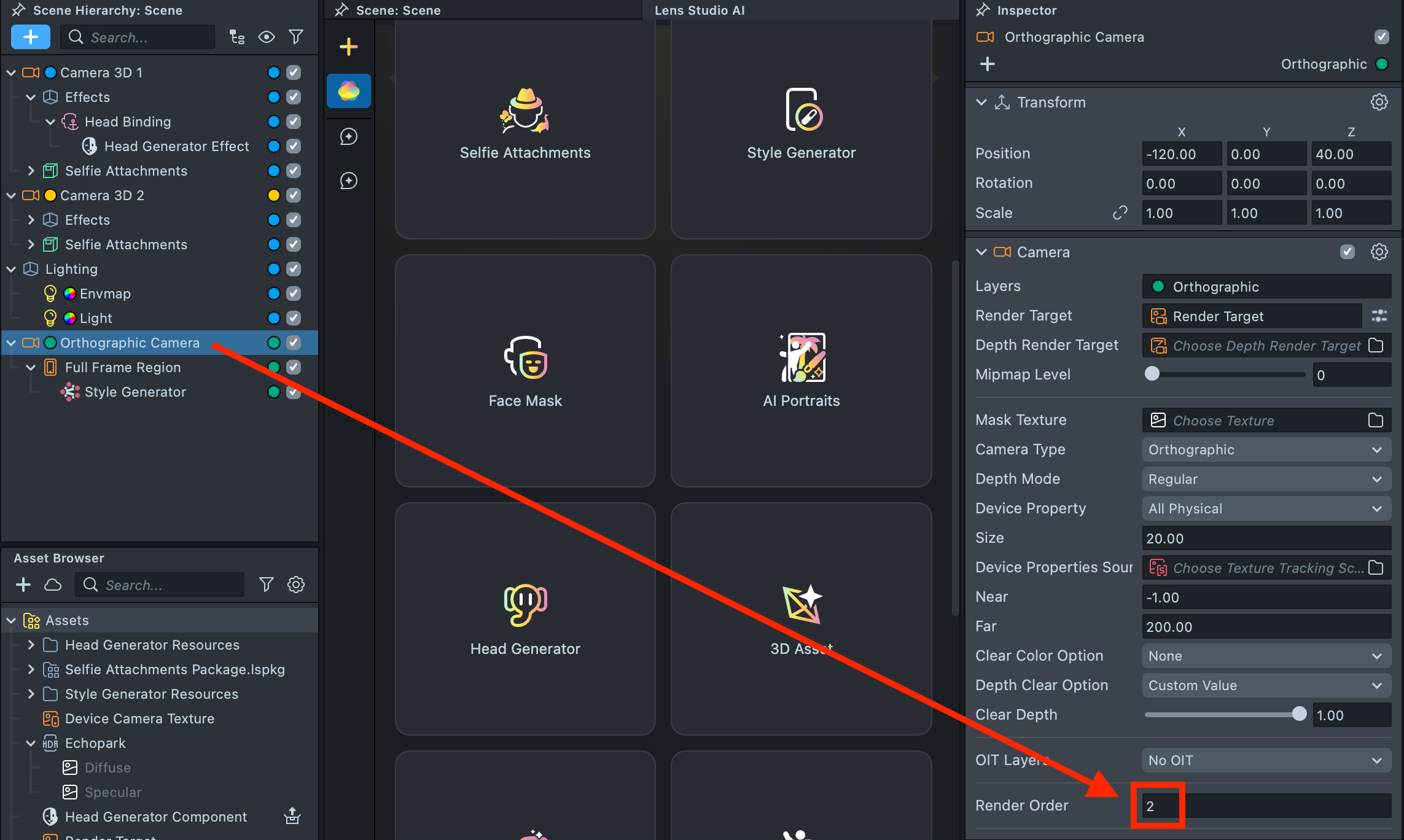 2.8. Select the Orthographic Camera and set its Render Order to 2.