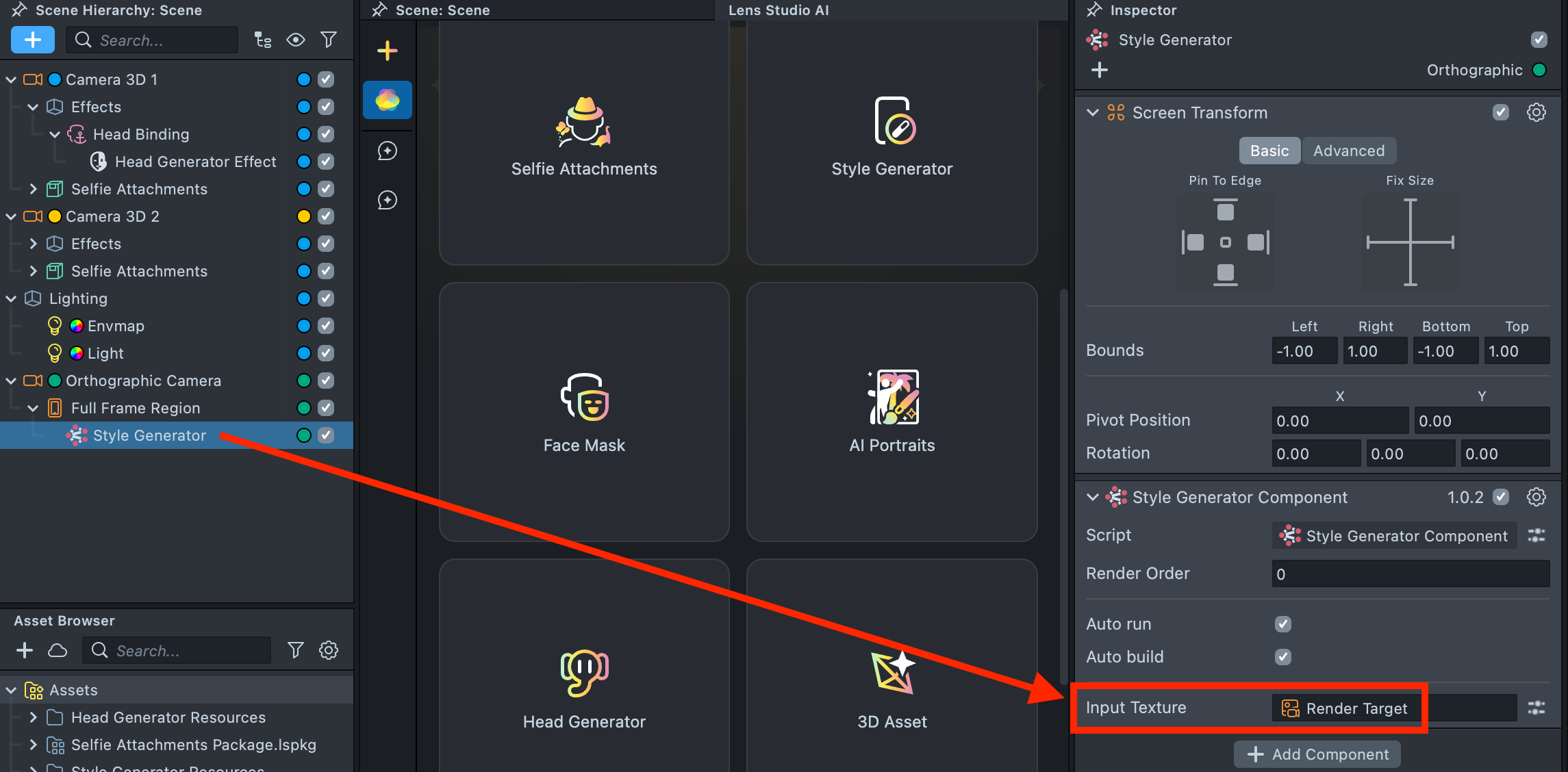 2.9. In the Scene Hierarchy, locate the Style Generator object. In the Inspector, replace the Input Texture with the Render Target.