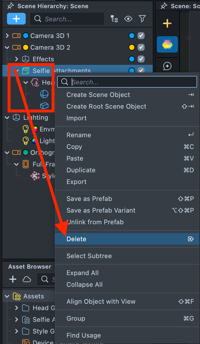 2.11. Remove the duplicate Selfie Attachments from Camera 3D 2. Now, Selfie Attachments should remain in Camera 3D 1, and Head Generator should remain in Camera 3D 2.