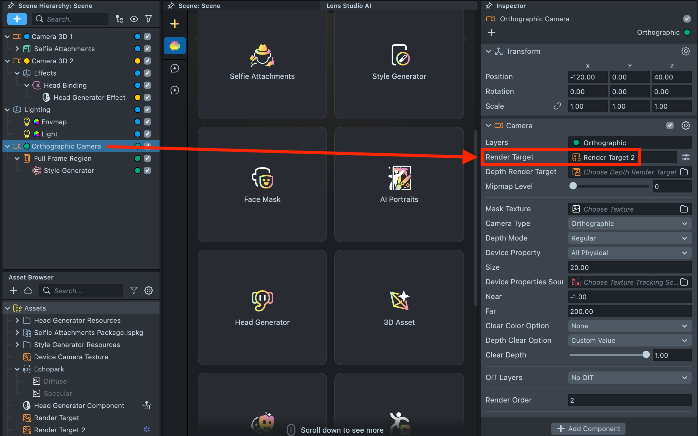 2.14. Select the Orthographic Camera and set its Render Target to Render Target 2.