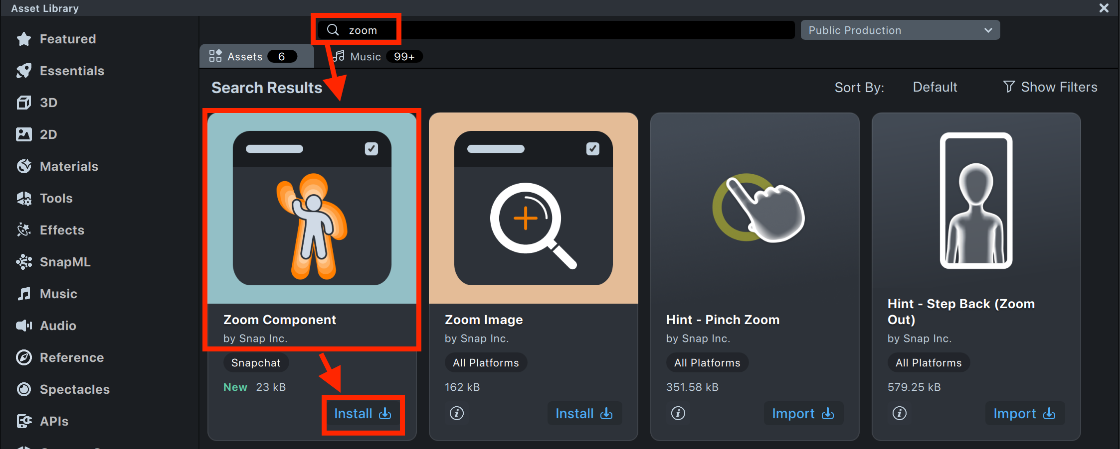 3.1. Open the Asset Library, search for Zoom Component, and click Install. The component will appear in both the Asset Browser and the Scene Hierarchy.