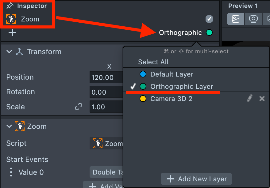 3.2. Drag the Zoom into the Orthographic Camera.