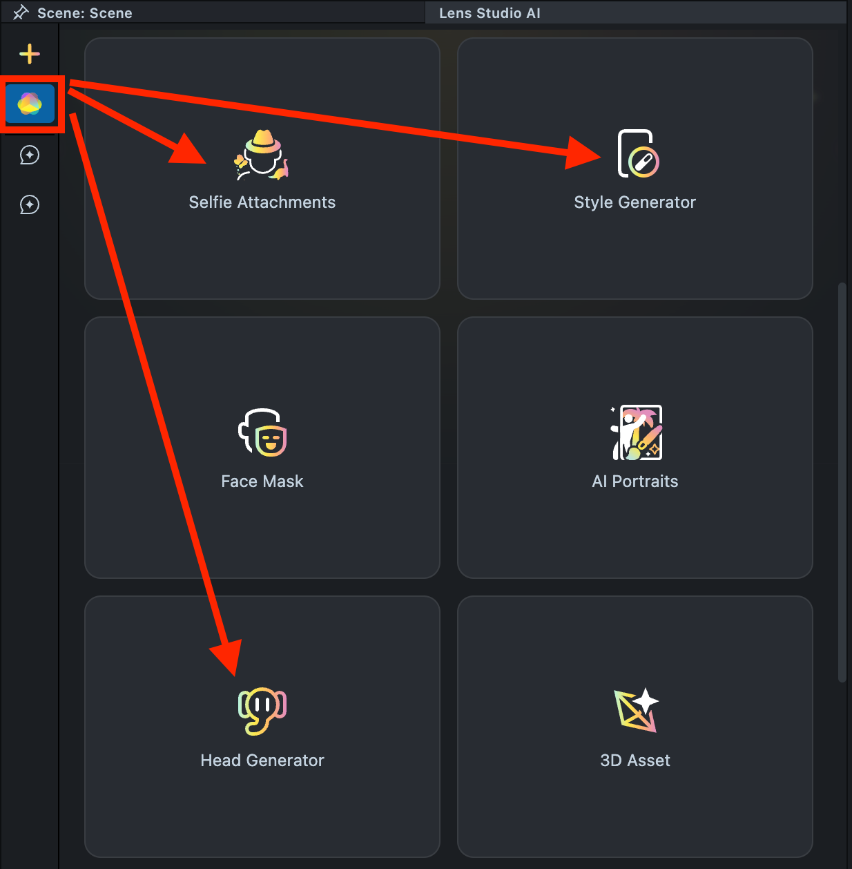 1.1. Navigate to the Lens Studio AI option in the top right corner of the Lens Studio. Then, click on the GenAI Home Page tab in the sidebar.
