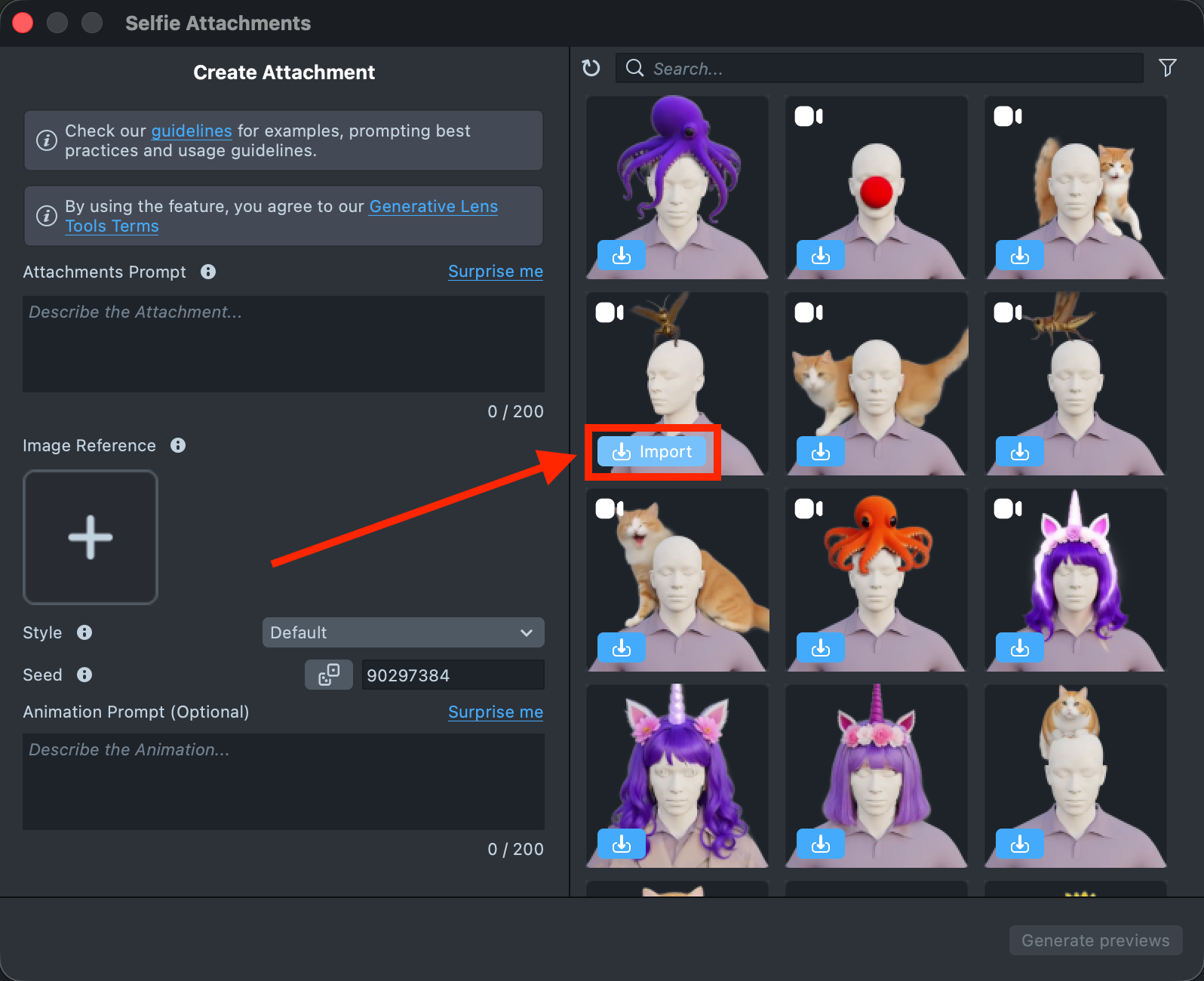 1.4. In the GenAI Home Page, find the Selfie Attachments and import a generated effect into your project.