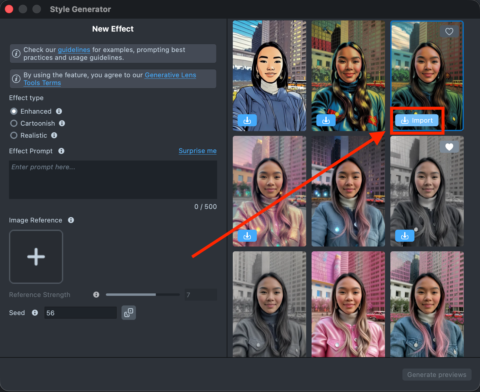 1.3. Open the Style Generator plugin and import a generated effect into your project. If you don’t have any generated effects yet, refer to the Style Generator web page to learn how to create one.