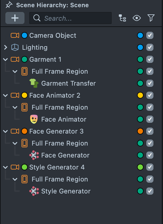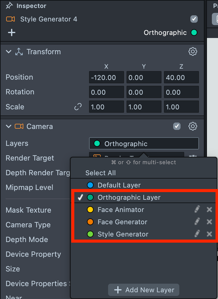 2.2. Create a Render Layer for each camera and name them accordingly: Face Animator, Face Generator, Style Generator (we will use the existing Orthographic Layer for the Garment effect).