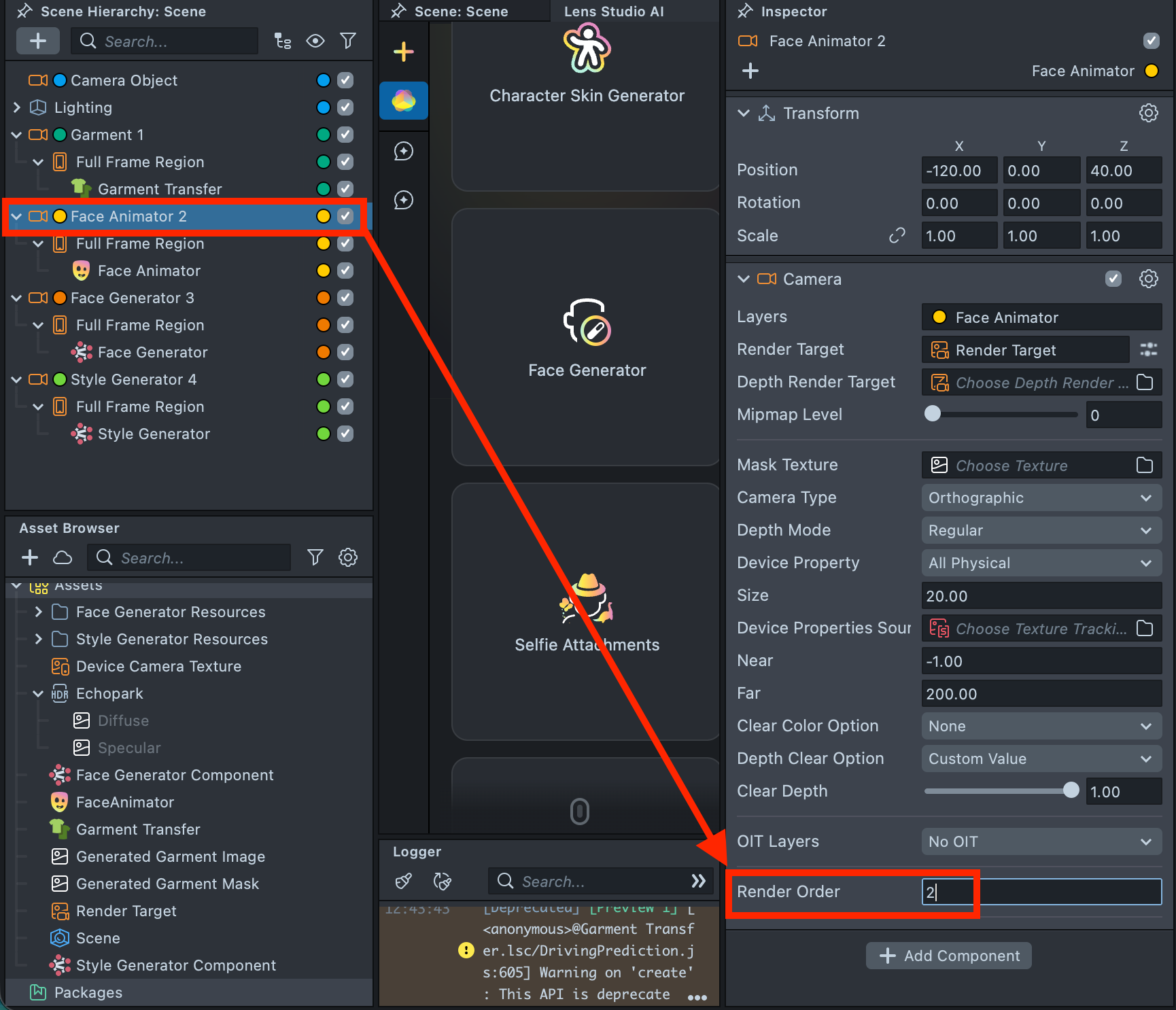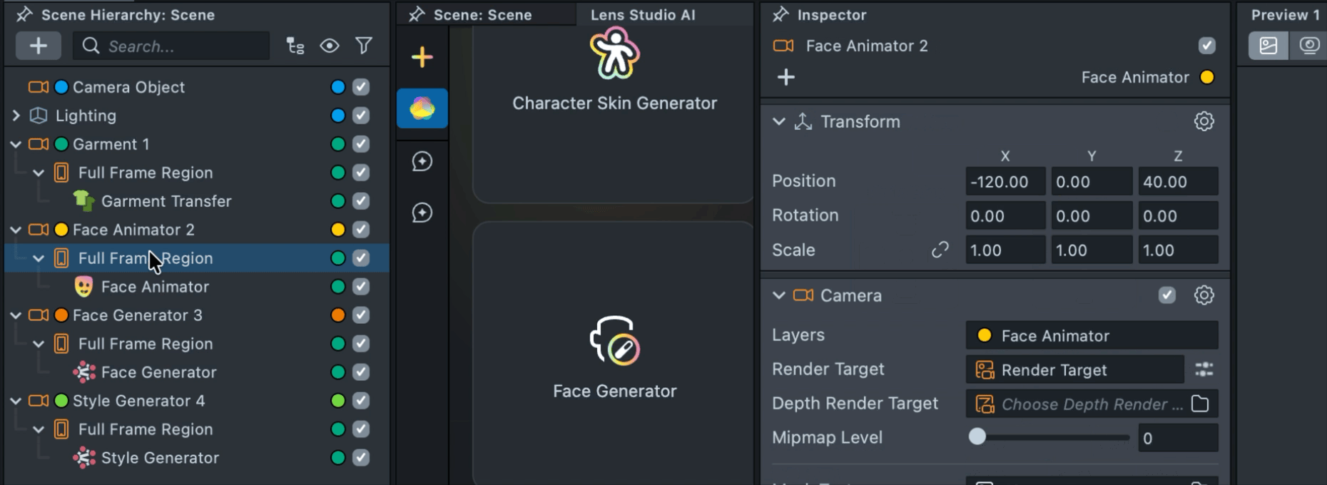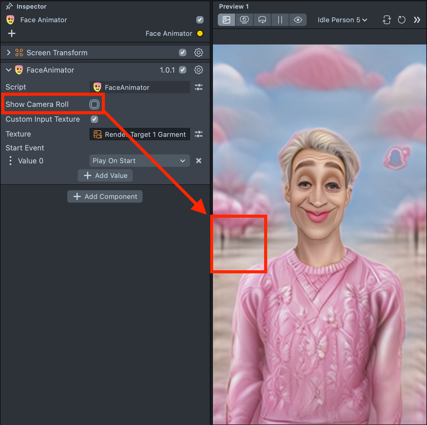 2.19. You may notice that the Style Generator effect appears on top of the Camera Roll button. This behavior is built into the Face Animator component to simplify workflows for basic Lenses. However, this built-in logic does not handle complex camera and effect structures correctly. To resolve this, open the Face Animator component and disable Show Camera Roll.