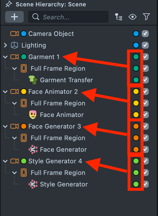 2.4. In the Scene Hierarchy, drag each effect into its corresponding camera (including their parent object, Full Frame Region).