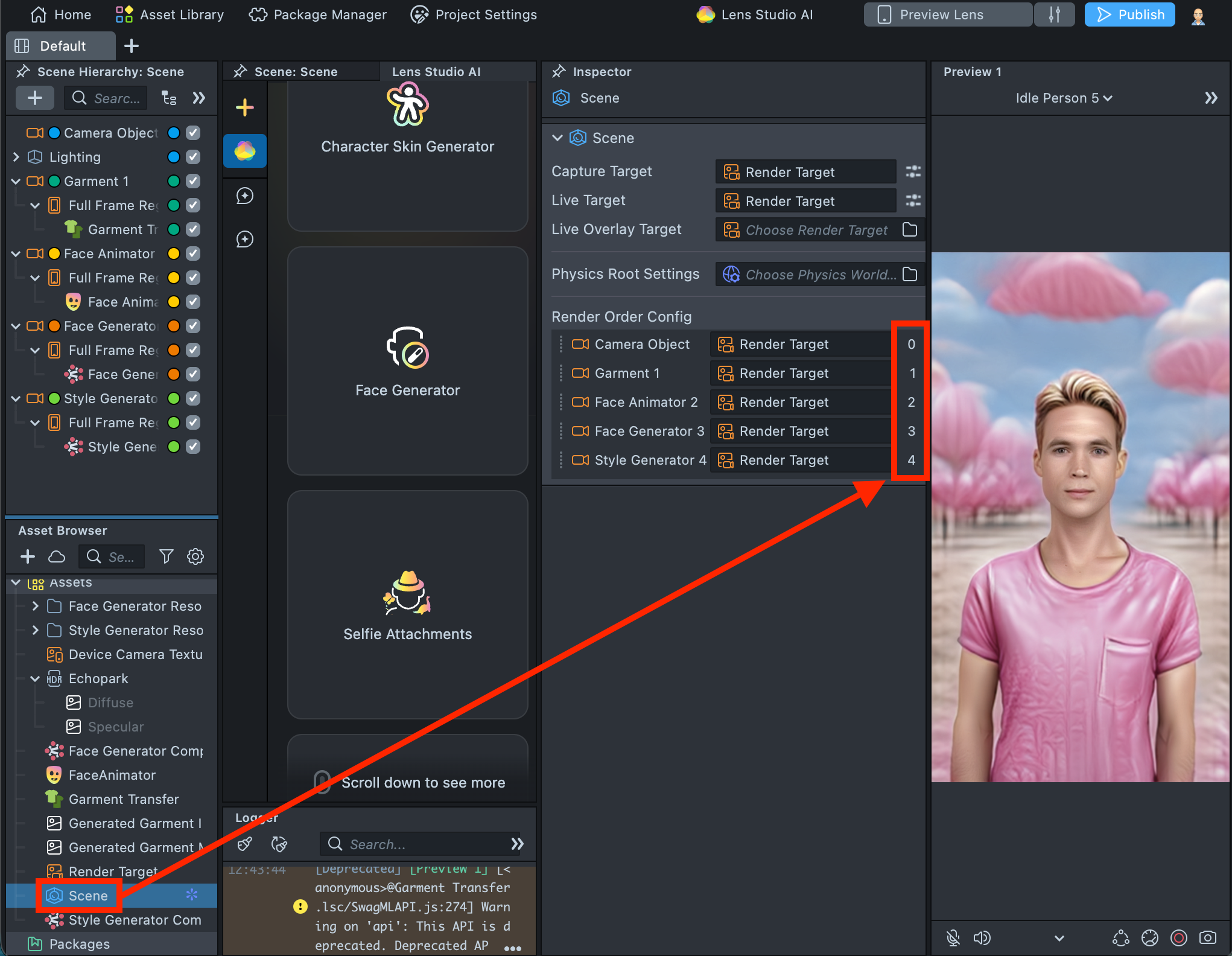 2.7. Select Scene in the Asset Browser, then review the Render Order configuration in the Inspector to ensure the values are set sequentially.