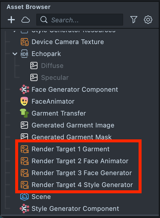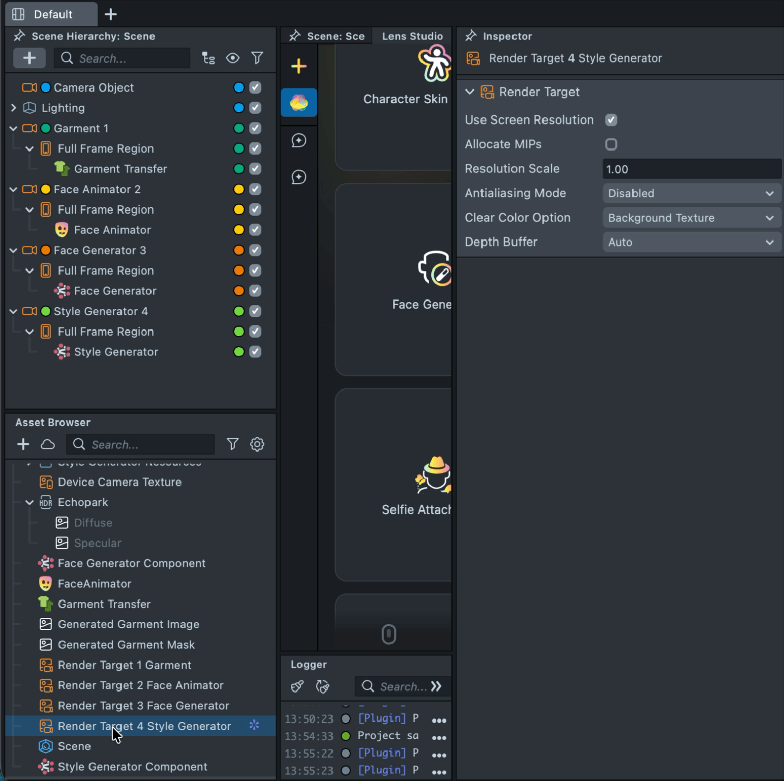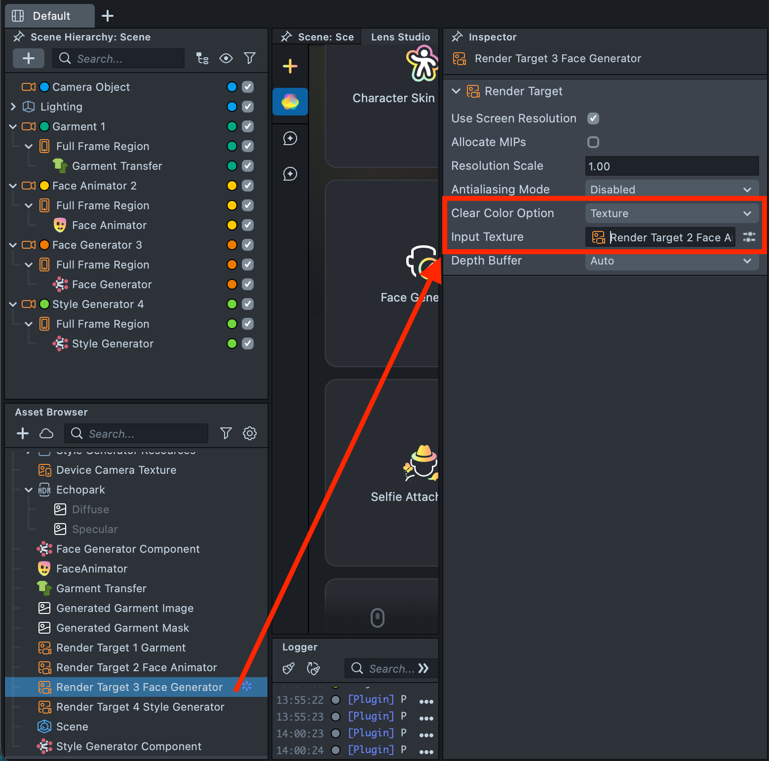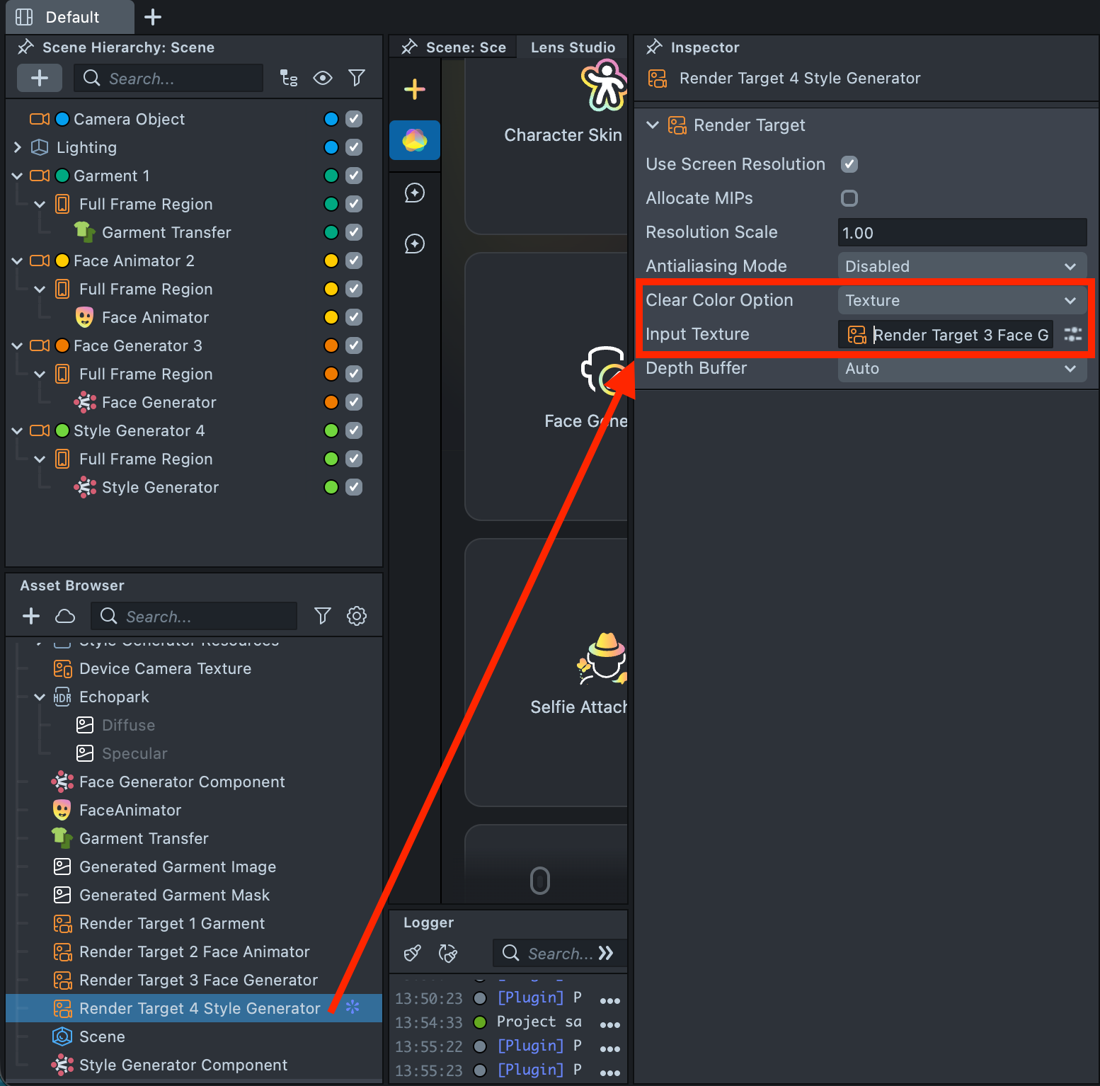 2.12. Next, configure Render Target 4 Style Generator so that it receives the output of the previous Render Target. Select Render Target 4 Style Generator in the Asset Browser. In the Inspector, under Clear Color Option, choose Texture, then set the Input Texture to Render Target 3 Face Generator.