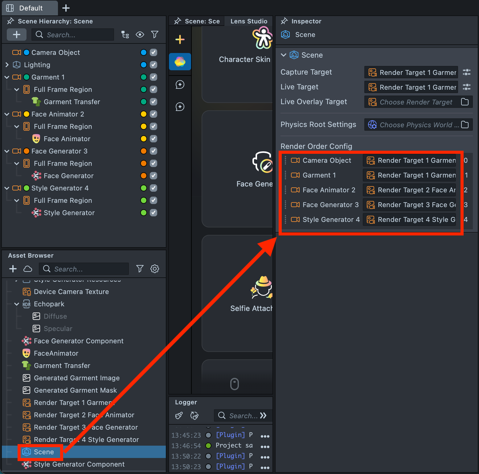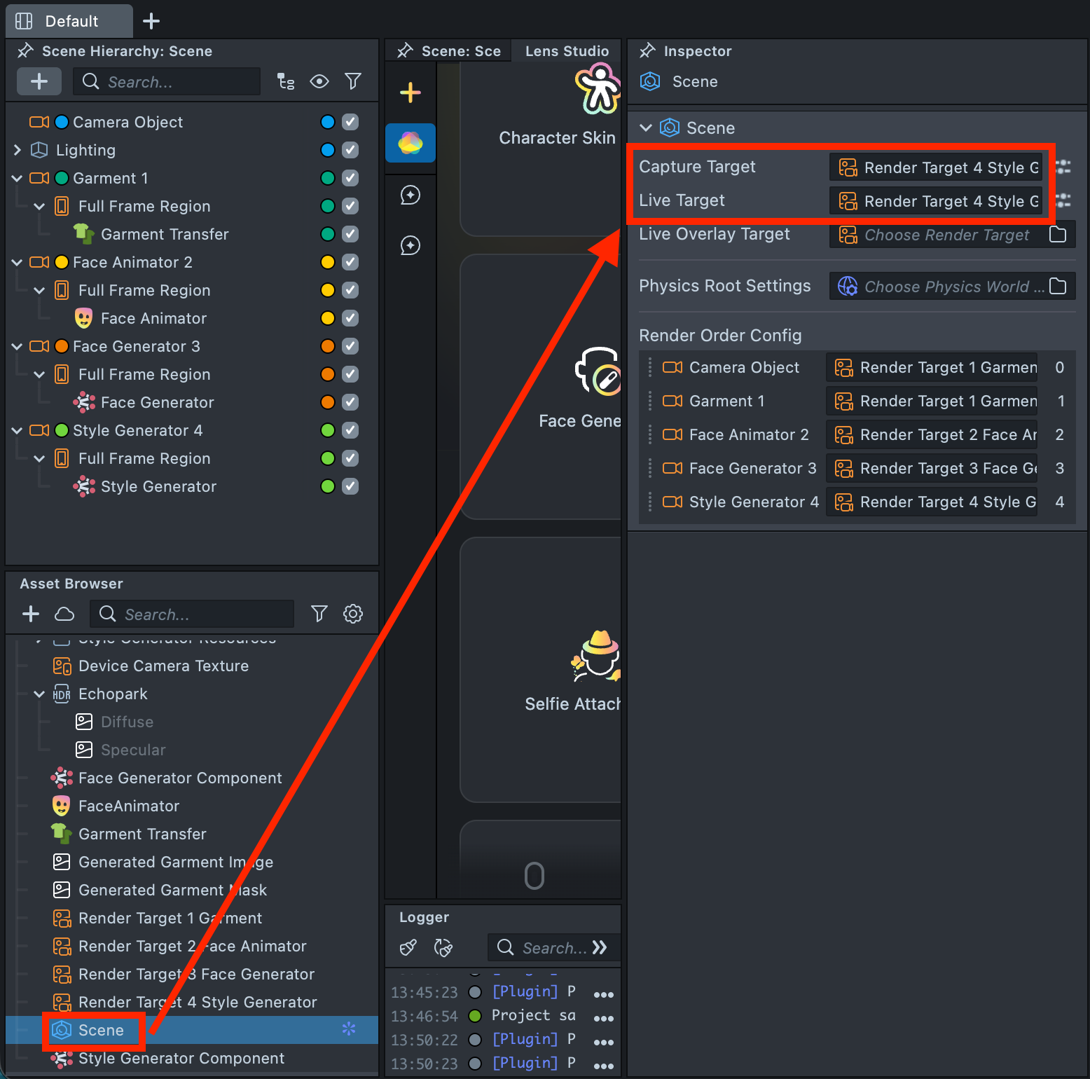 2.10. Select Scene in the Asset Browser, then verify the Render Target configuration in the Inspector to ensure each camera is assigned correctly.