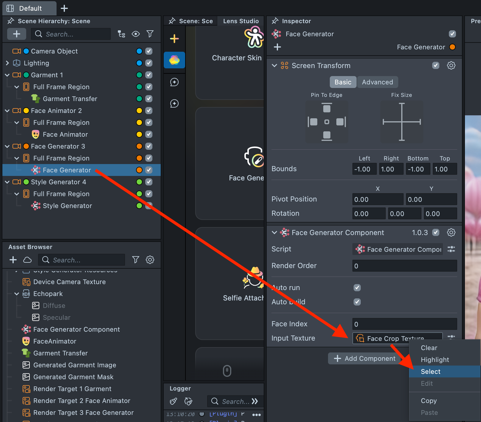 2.15. Open the Face Generator component and locate Face Crop Texture. Hover over it, right-click, and select Select.