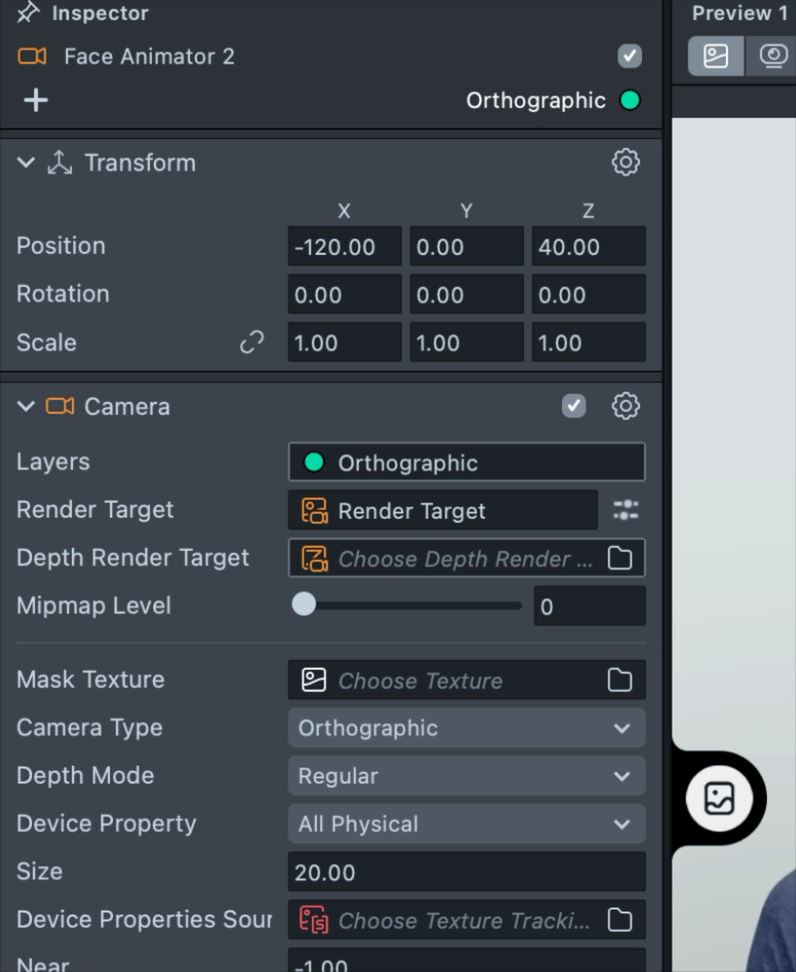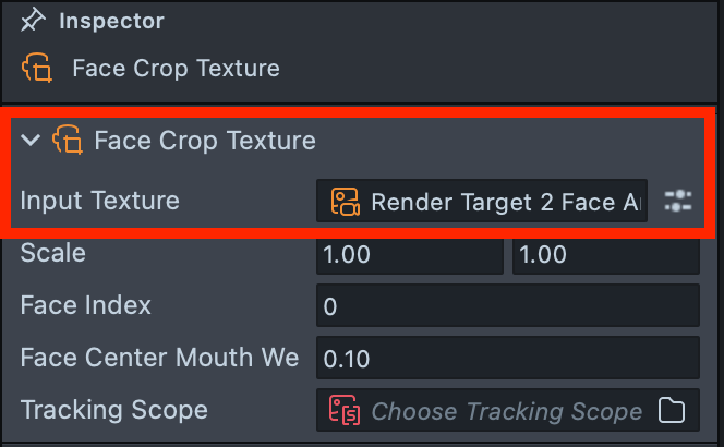 2.16. In the Inspector for the opened Face Crop Texture, set Render Target 2 Face Animator as the Input Texture.