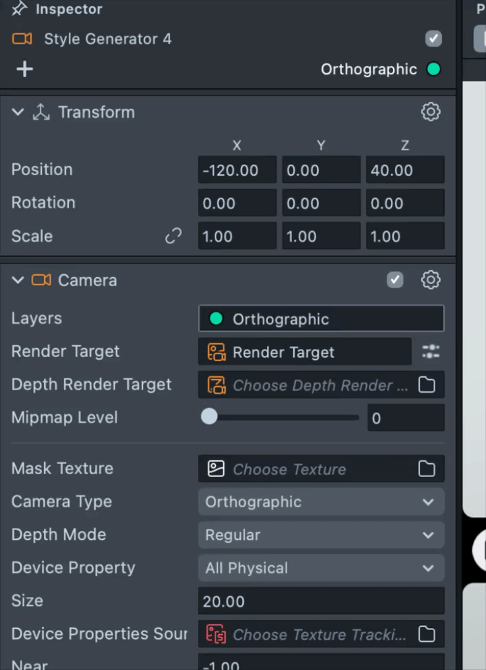 2.6. In the Scene Hierarchy, select each camera and set the Render Order sequentially, starting from 0 for Camera Object and ending with 4 for Style Generator 4.