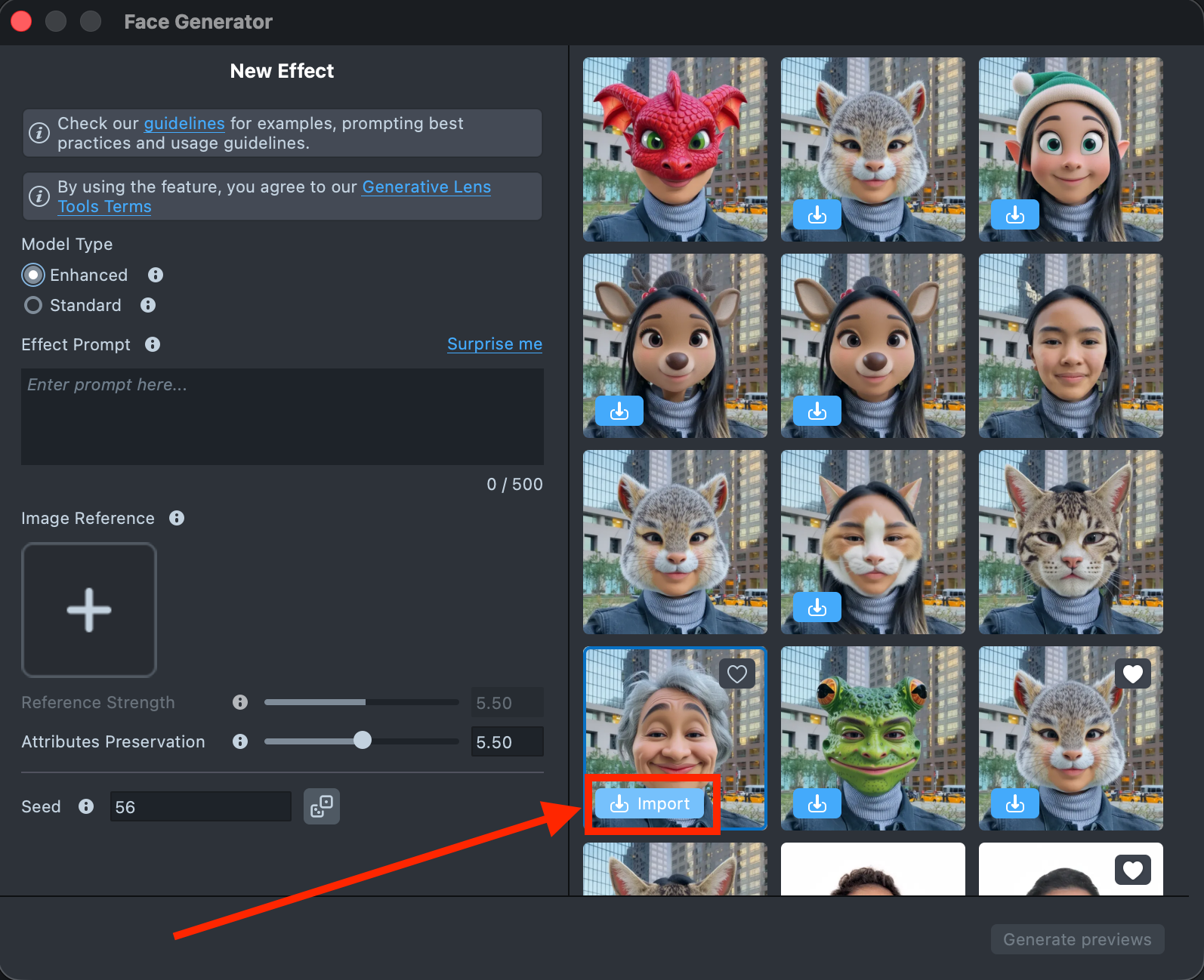 1.5. In the GenAI Home Page, find the Face Generator and import a generated effect into your project.