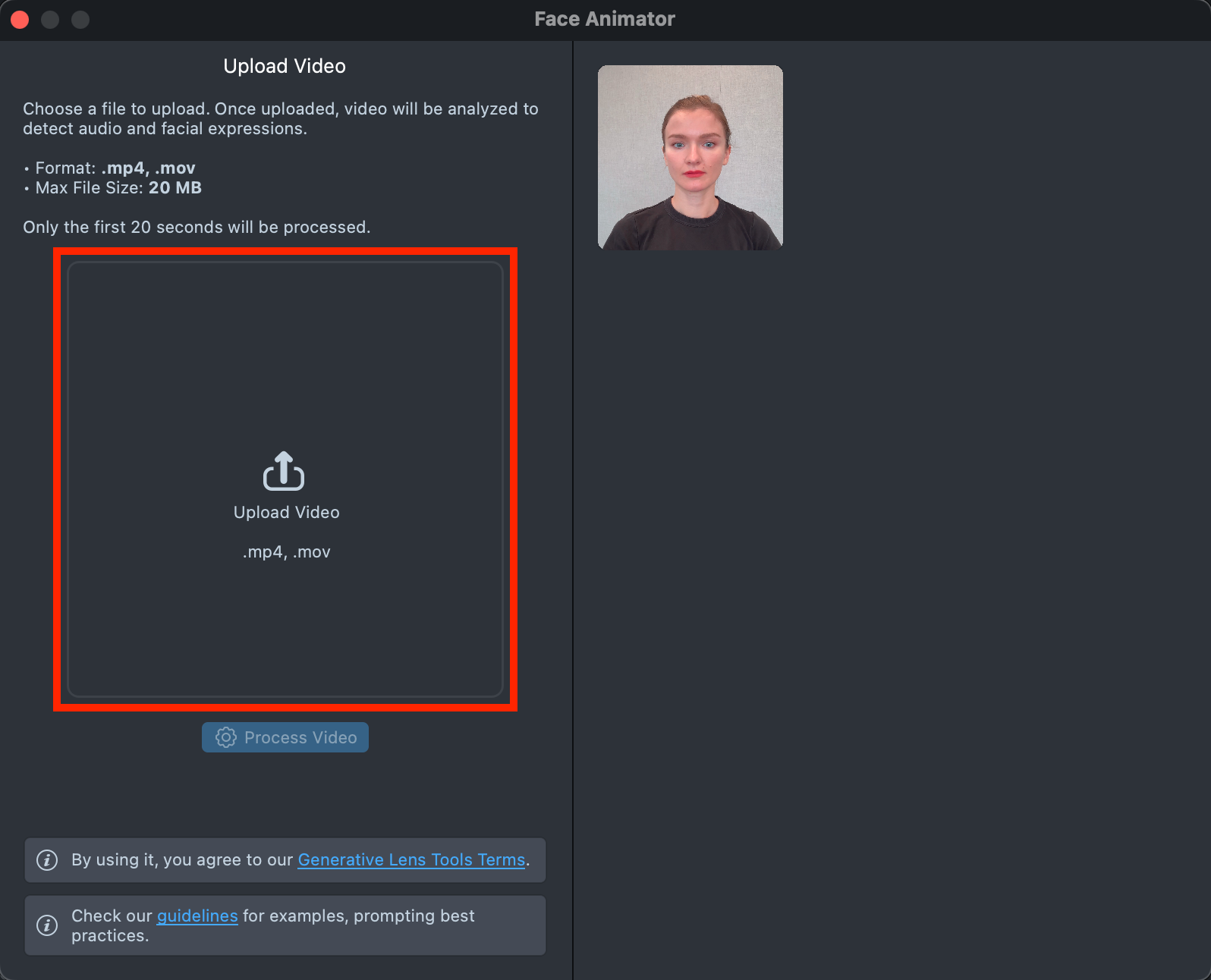 Launch Face Animator plugin. In the window that opens, you’ll see an option to upload your video file. Simply click the large placeholder labeled