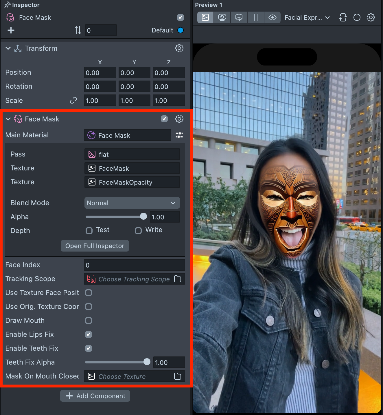 Visit the Face Mask Effect page for an overview of the effect and detailed information about the available Face Mask Component settings.
