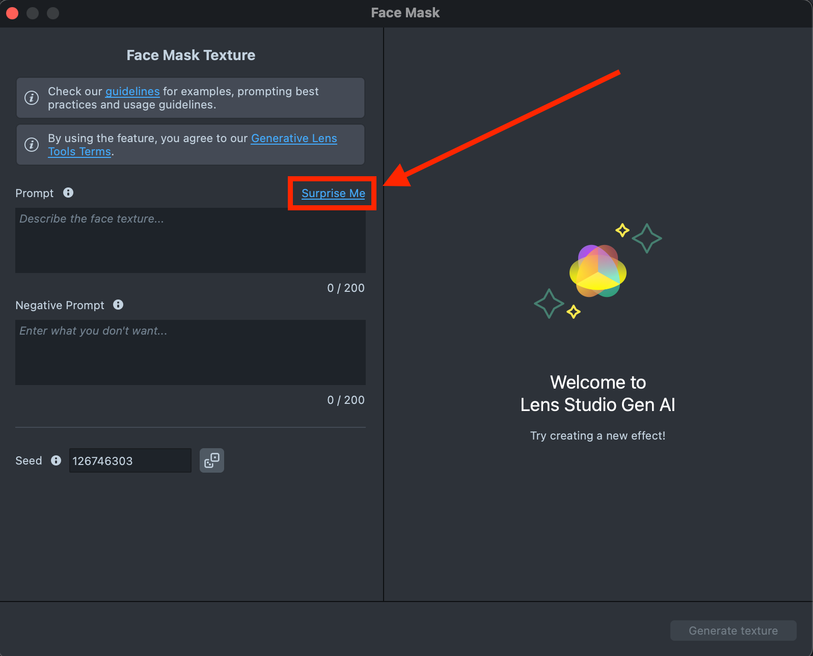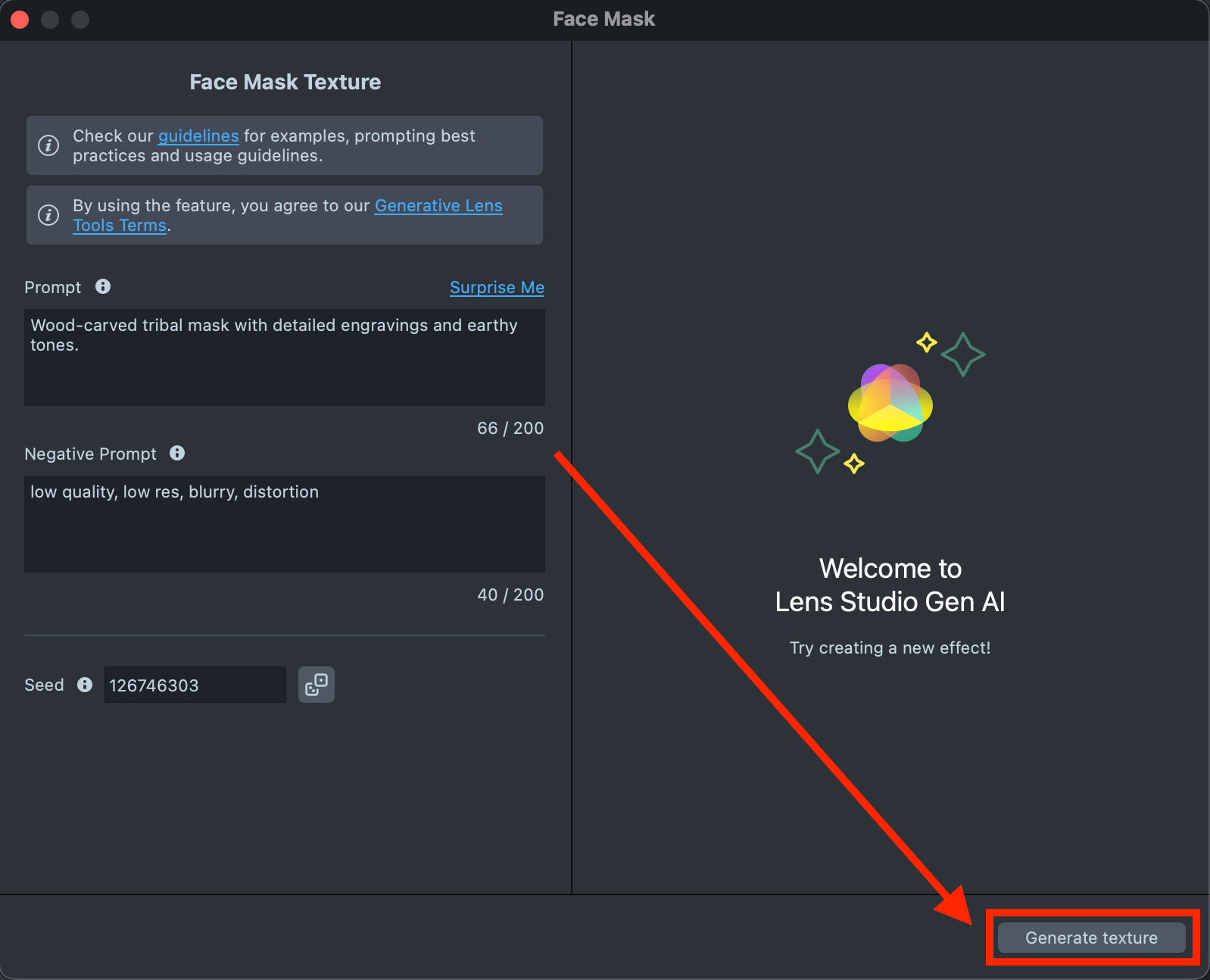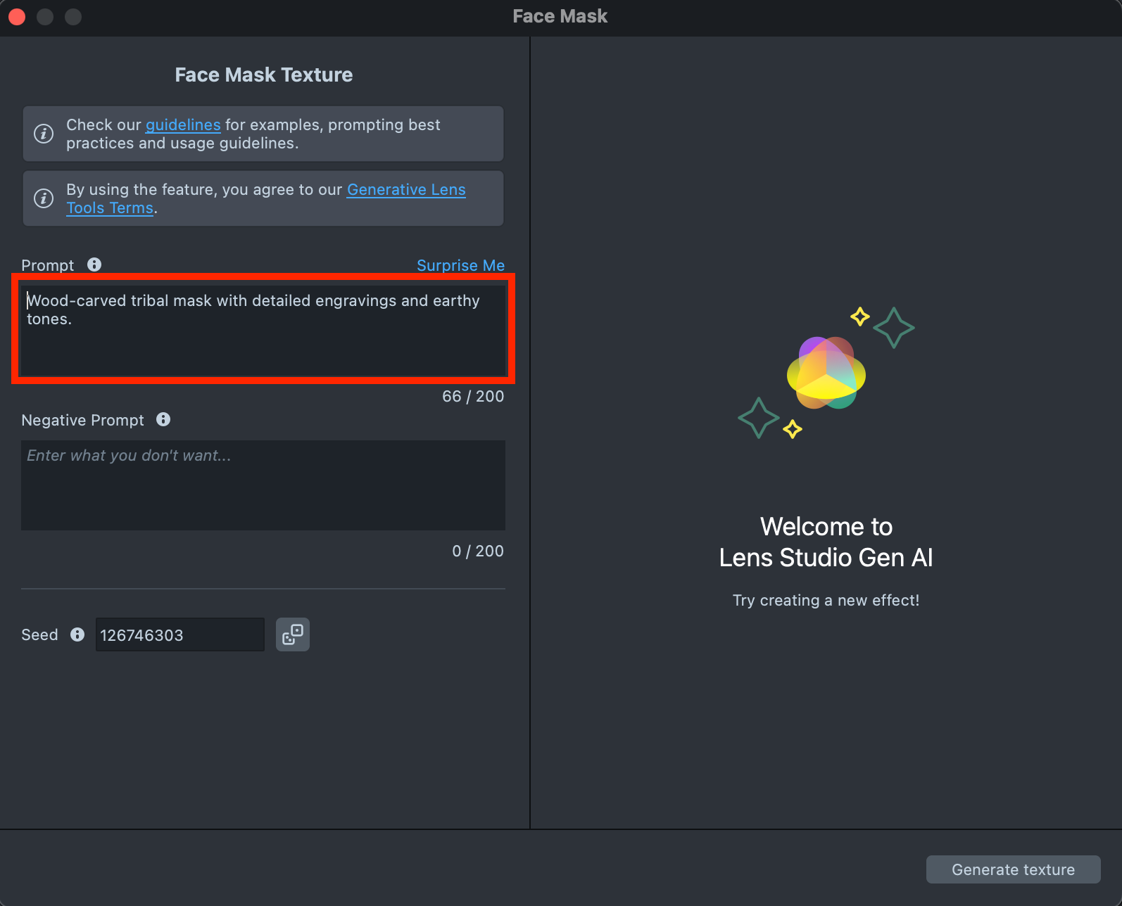 If you are ready to use your own prompt, enter a description of the Face Mask you’d like to generate in the