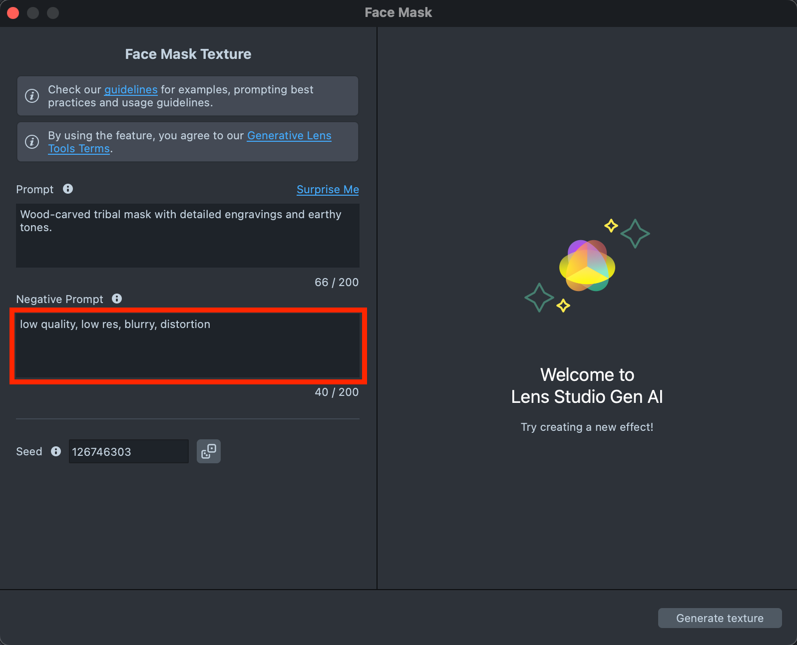 The Negative Prompt field is optional and allows you to list elements you don’t want to appear on your mask. This can include both visual aspects (such as specific colors, shapes, or styles) and texture-quality issues you’d like to avoid.