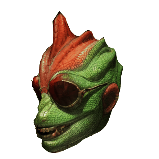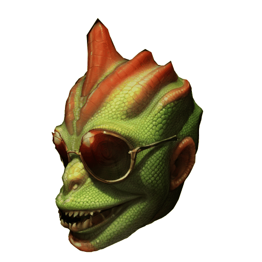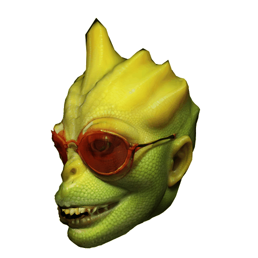 - Works best: 1 human head, big sunglasses, red curly hair, realistic portrait, green lizard skin, good quality, highres, hipoly model, snake teeth, opened mouth