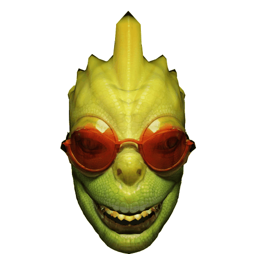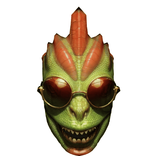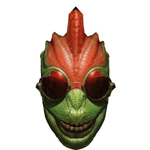 - Works best: 1 human head, big sunglasses, red curly hair, realistic portrait, green lizard skin, good quality, highres, hi poly model, snake teeth, opened mouth