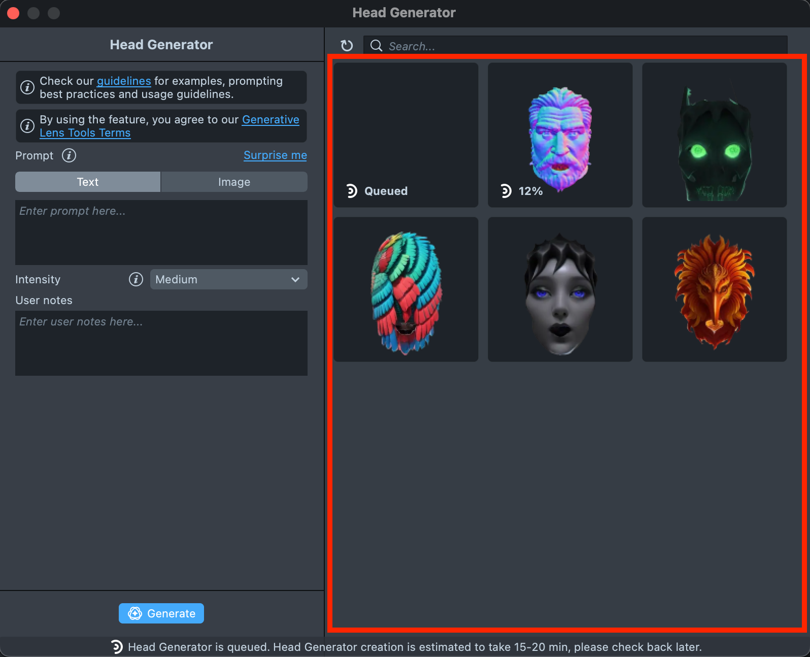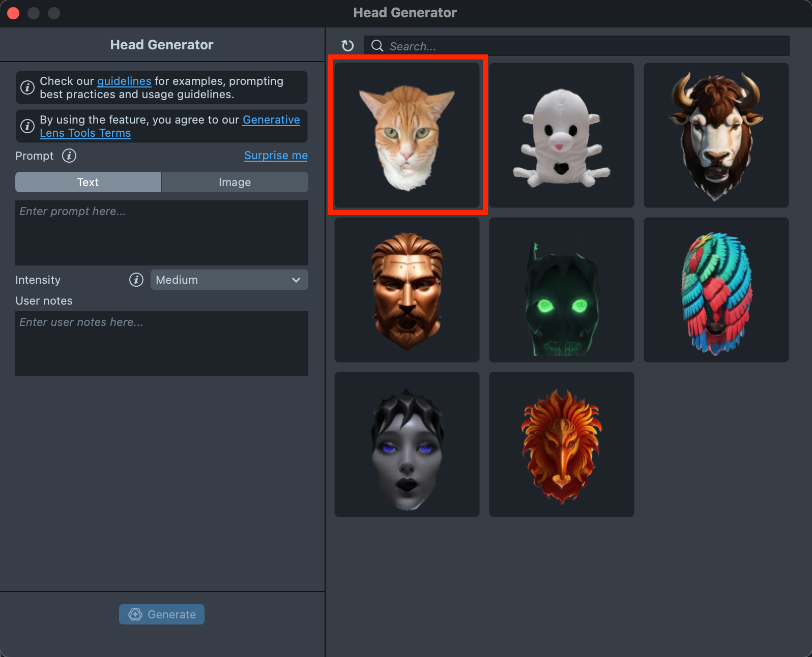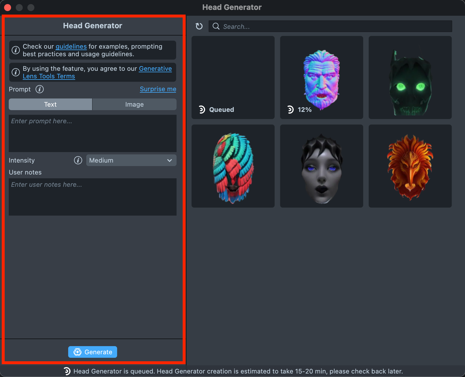 Head Generator is a powerful tool for generating and customizing 3D heads for creating Lenses. It uses AI to generate a 3D head, which can then be driven by facial expressions, similar to Face Morph.