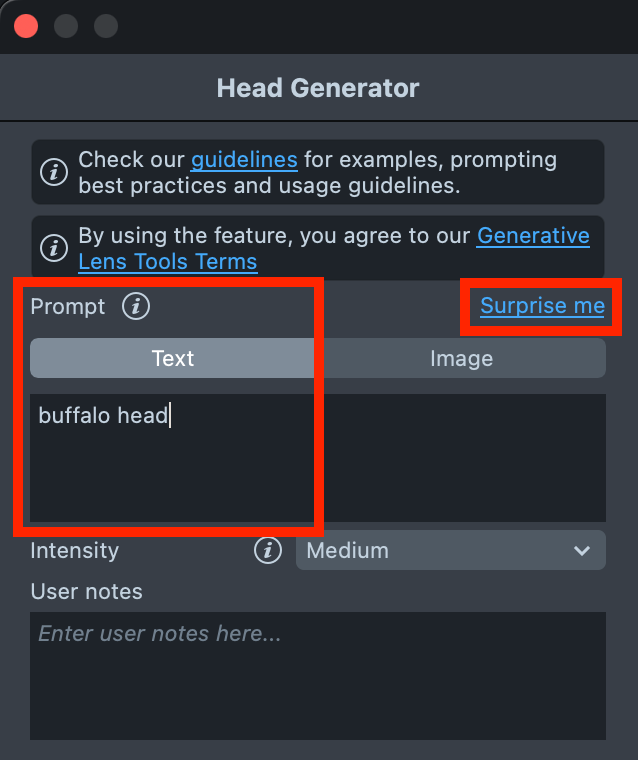 Text Referencefield to add context - for example, specify which part of the image should be used for generating the 3D Head or what modifications should be applied.