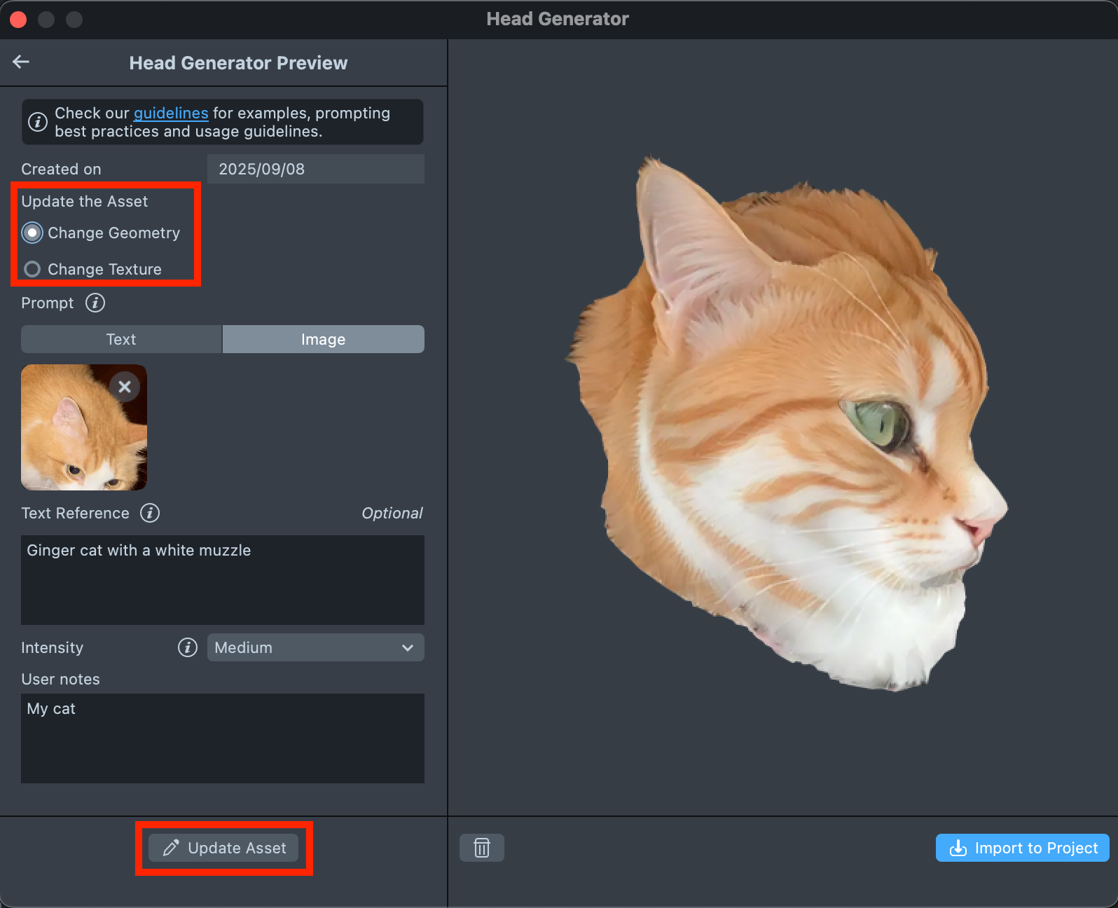 Change Geometry,Change Texture, or update the Text or Image prompts, then clickUpdate Assetto try again with the new changes. Your original asset will remain in the Gallery, and a new entity will be created.