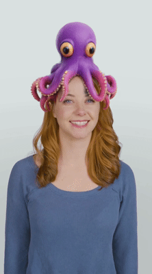 - "add a purple octopus with long tentacles sitting on top of my head"