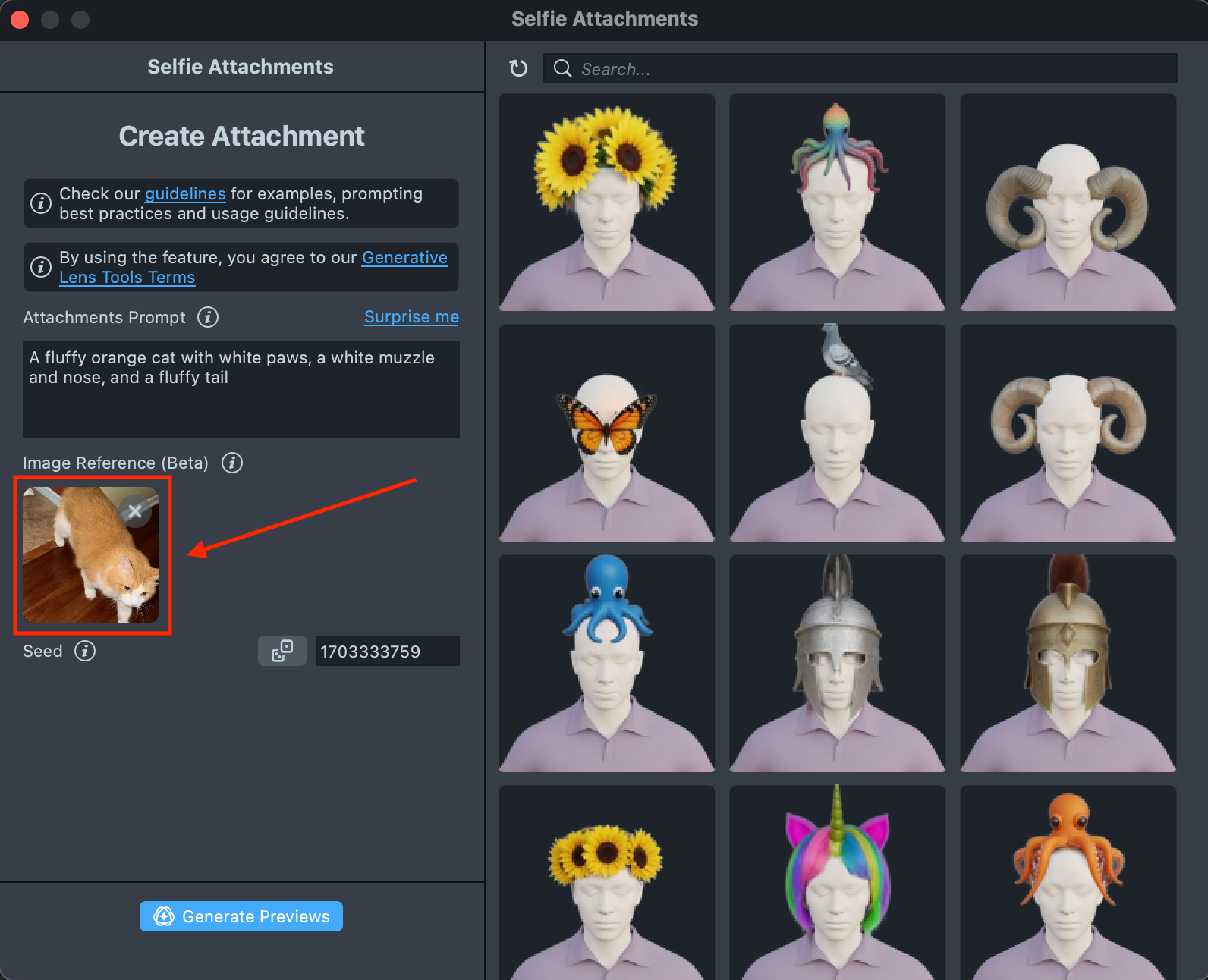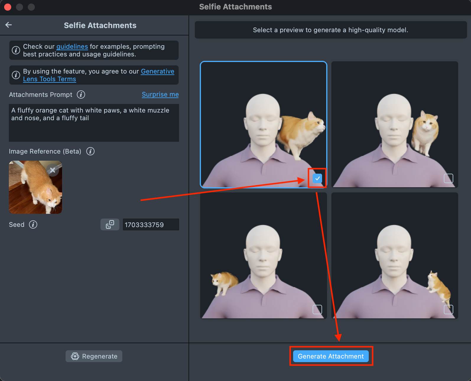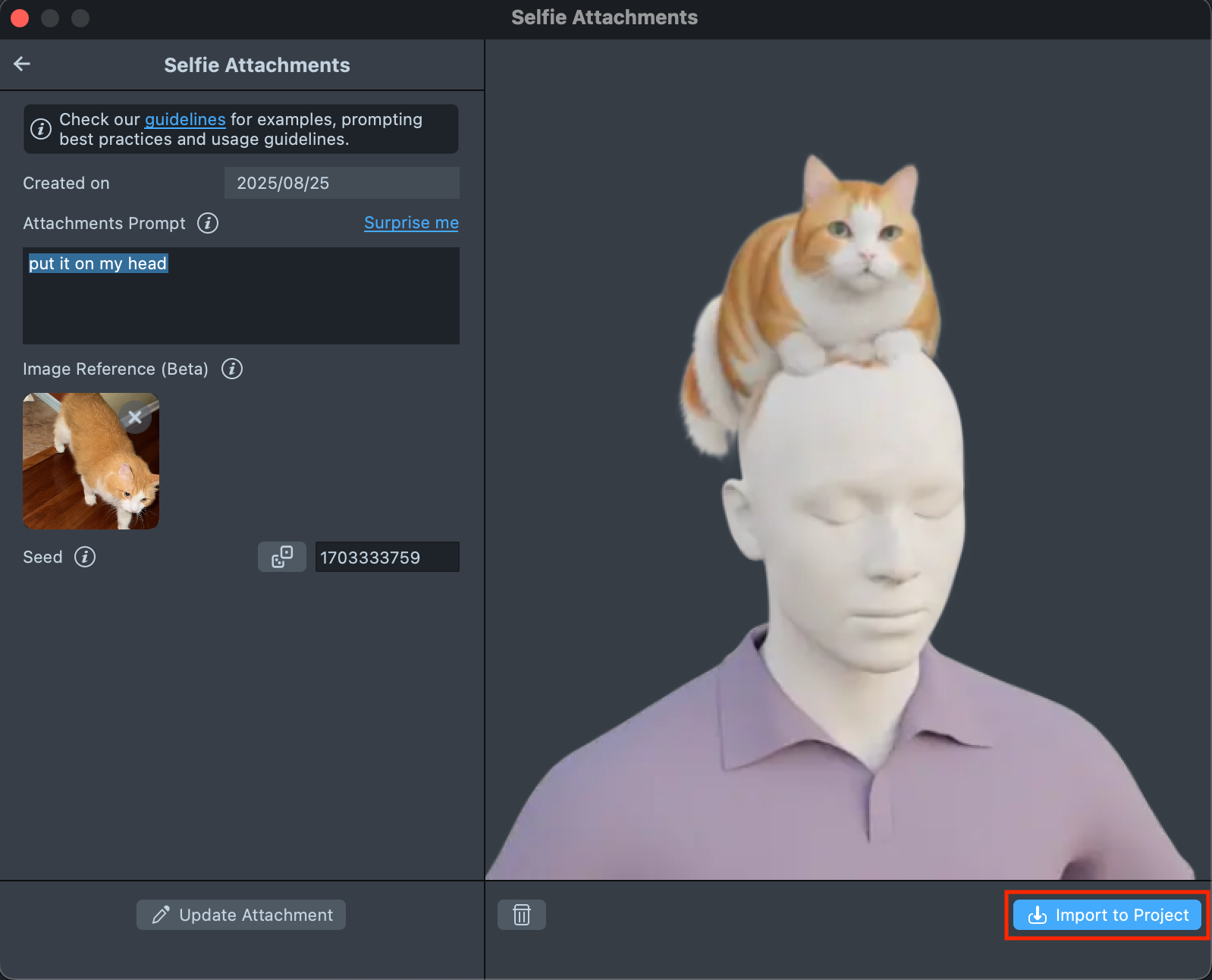 When the Attachment is ready, you can review it and adjust the asset by changing the prompt and seed. For example, you can provide a detailed description, or simply say "put it on my head" - both options work! Just hit the