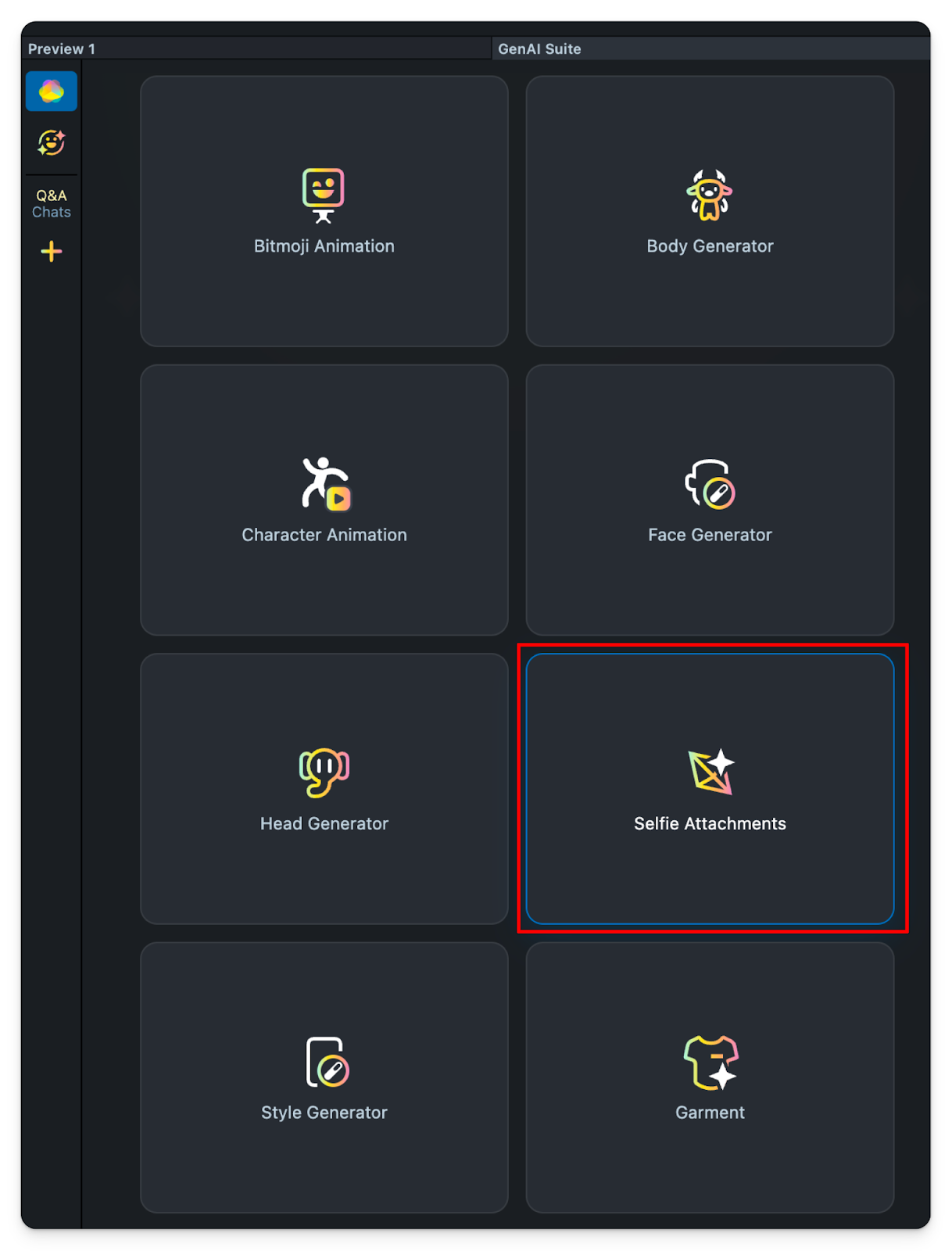 On the GenI Home Page, you may need to scroll down to find the menu of GenAI tools. In the panel, select Selfie Attachments.