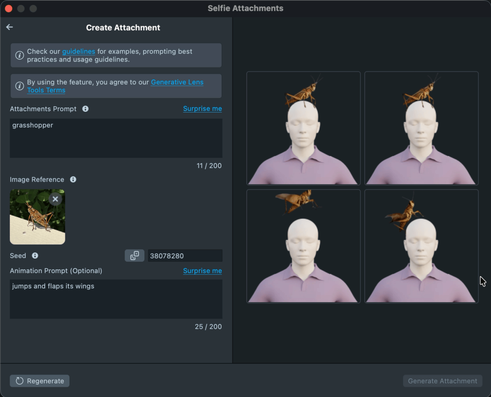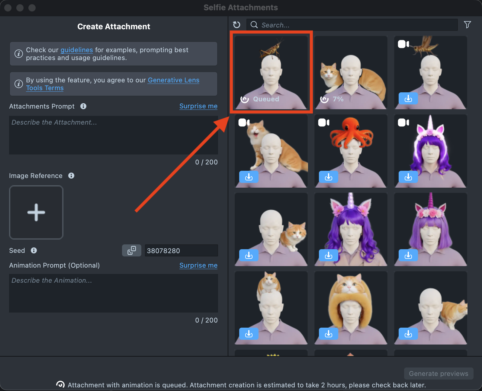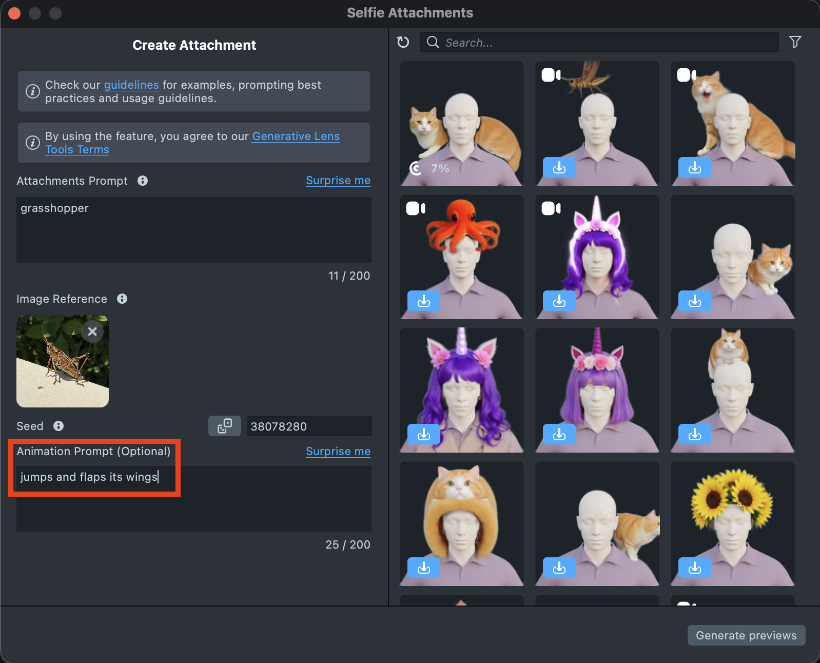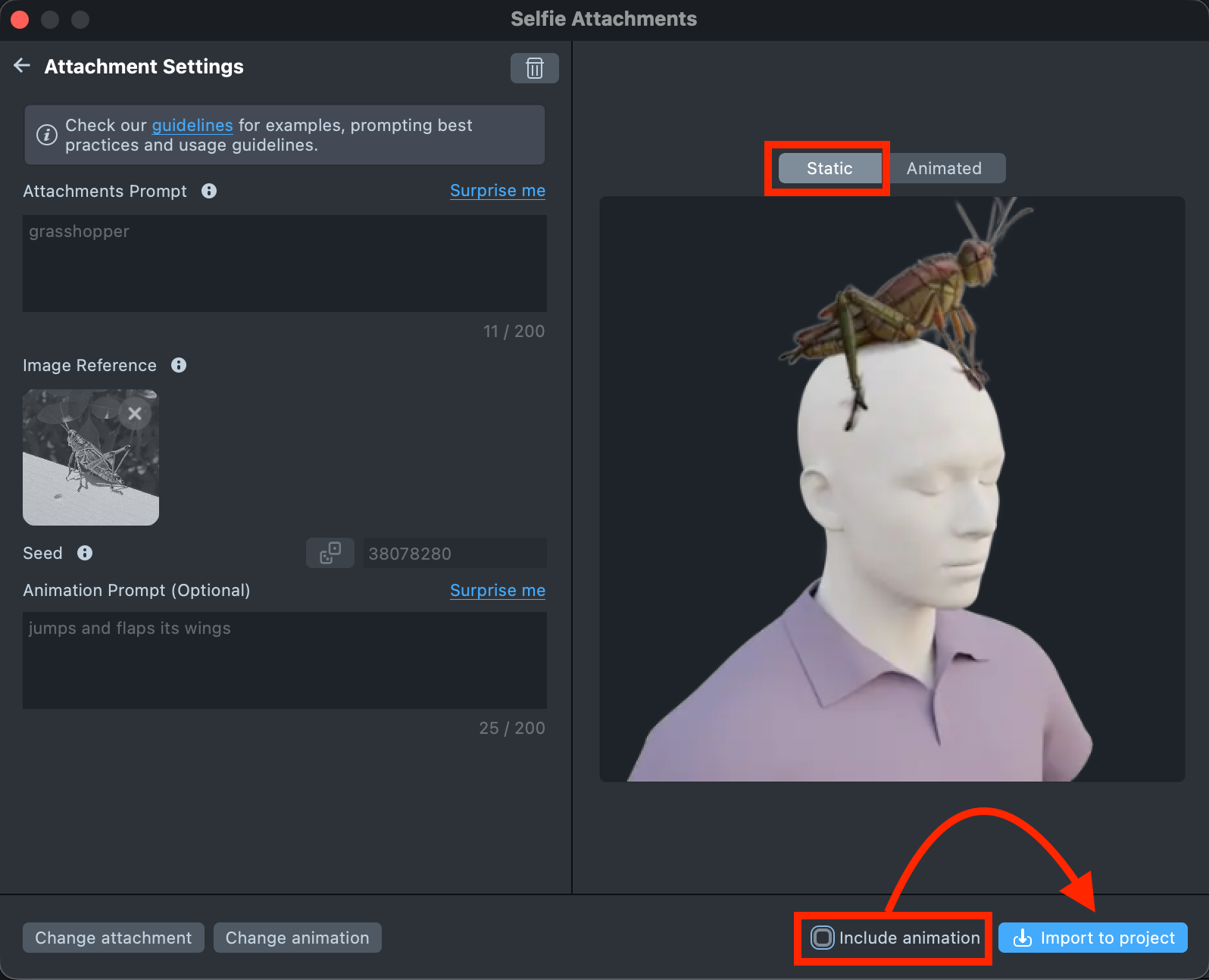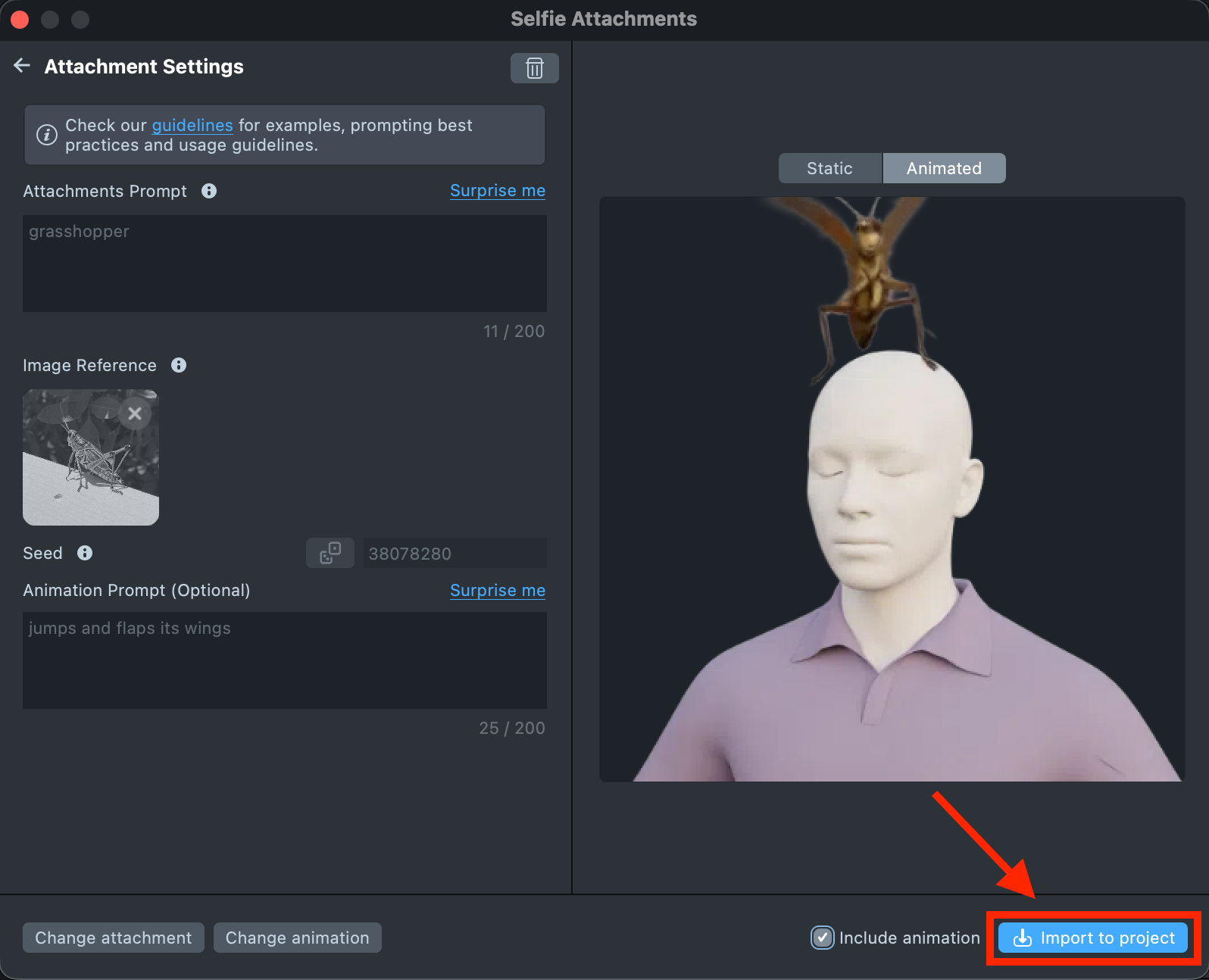 To create an animated attachment, simply add an animation description in the Animation Prompt field. Leave it blank if you want a static attachment.