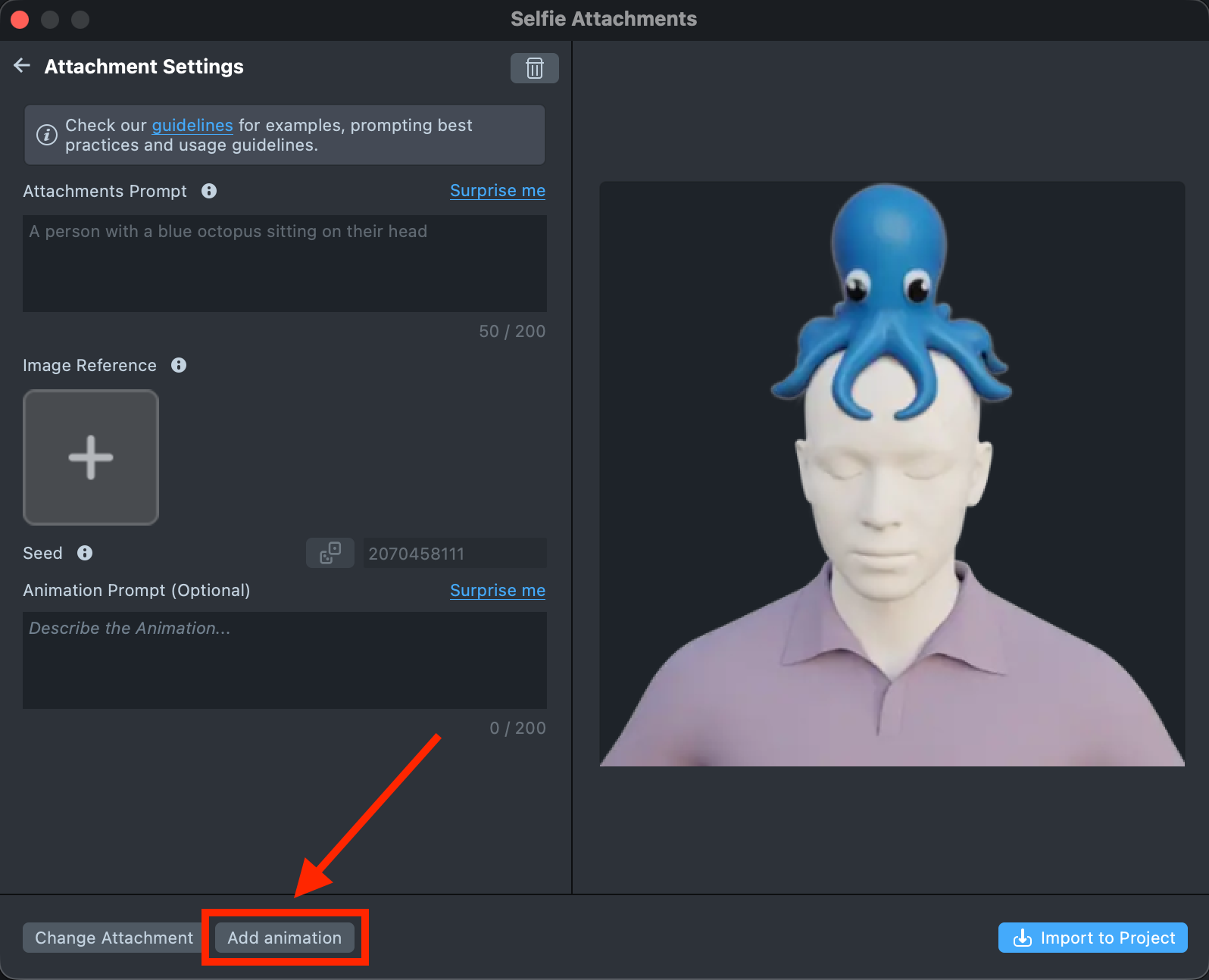 1. When you’re satisfied with the animated attachment, click Import to Project to add the asset to your project.