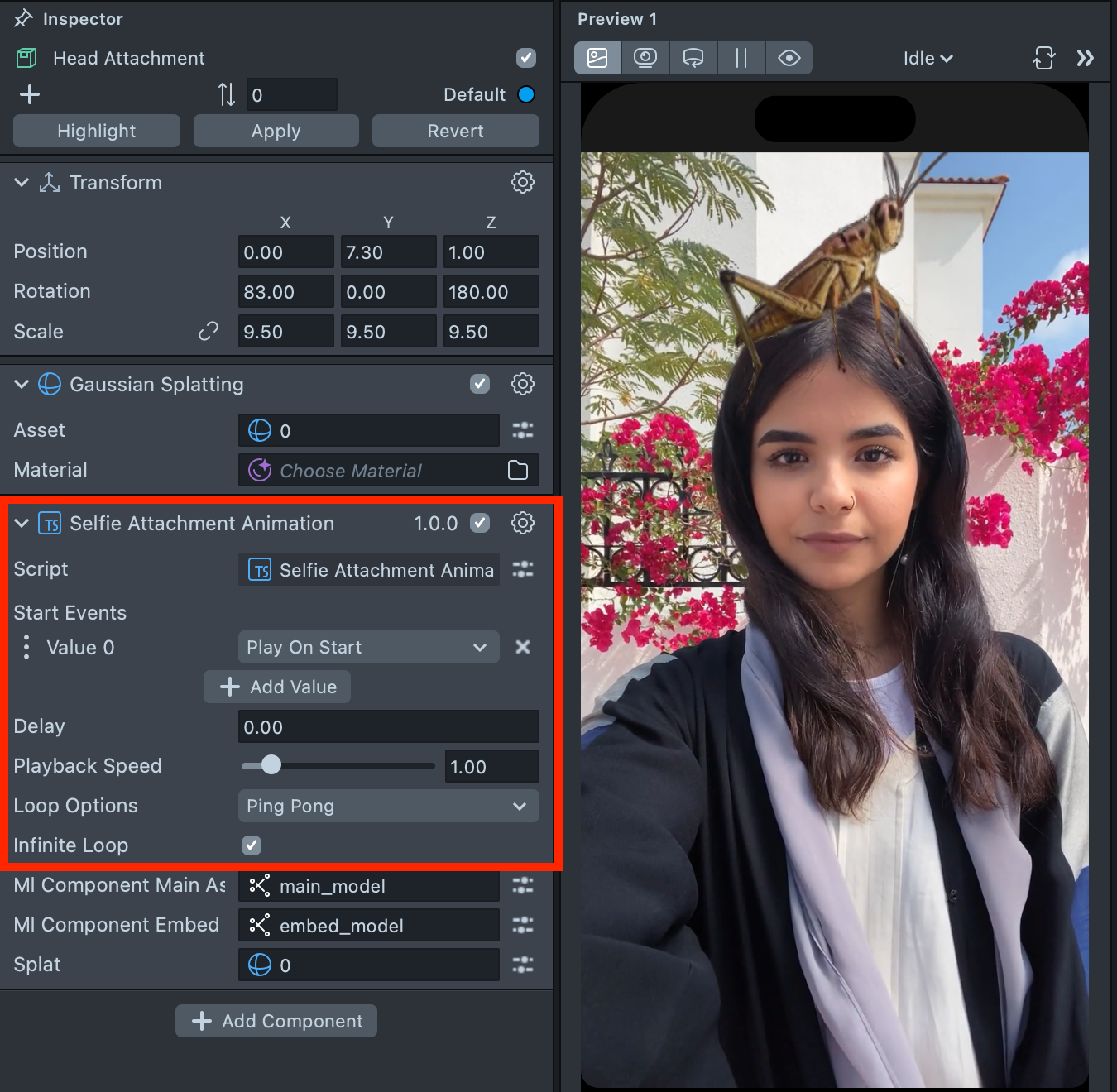 3. After you click Import to Project, all necessary elements will be added to the Scene Hierarchy, including the component itself. The component provides the following options for configuring the animated attachment: