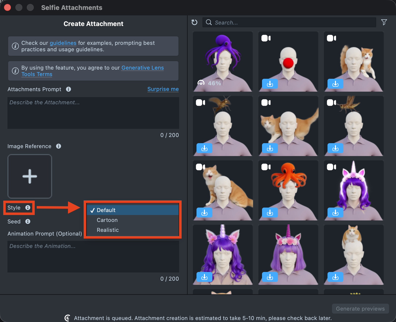 To create an animated attachment, add an animation description in the Animation Prompt field. Leave it blank if you want a static attachment.