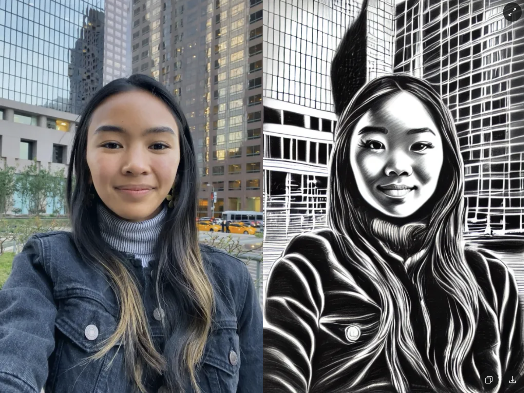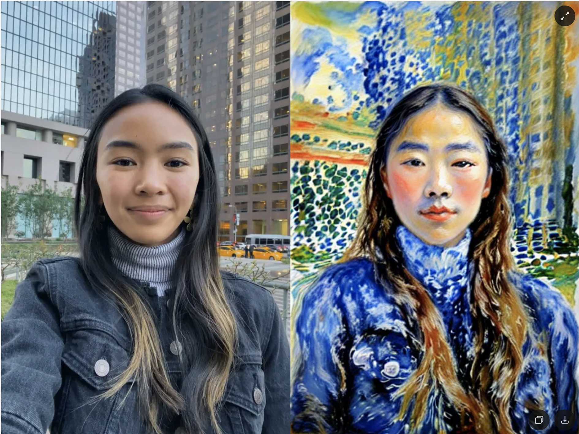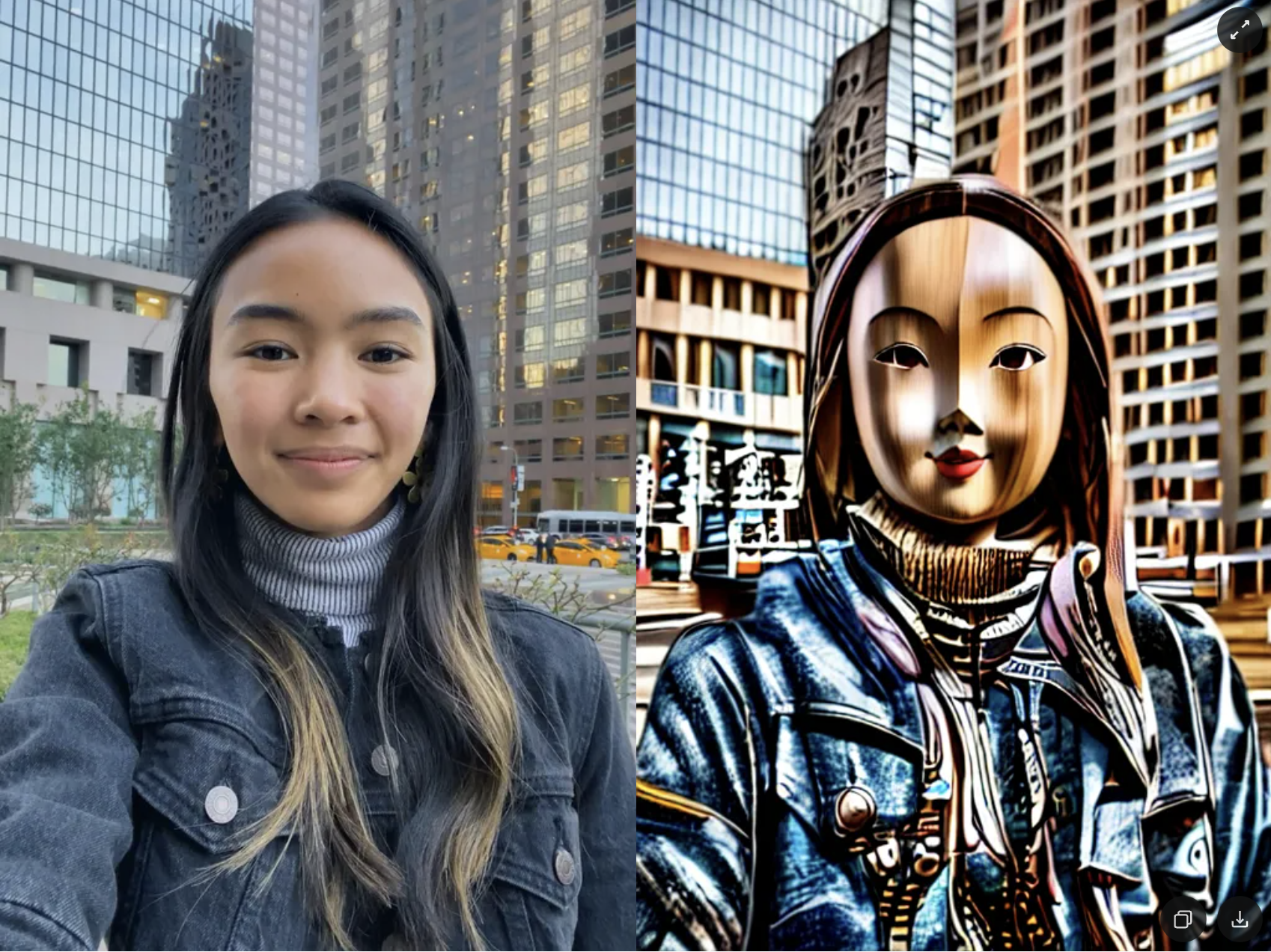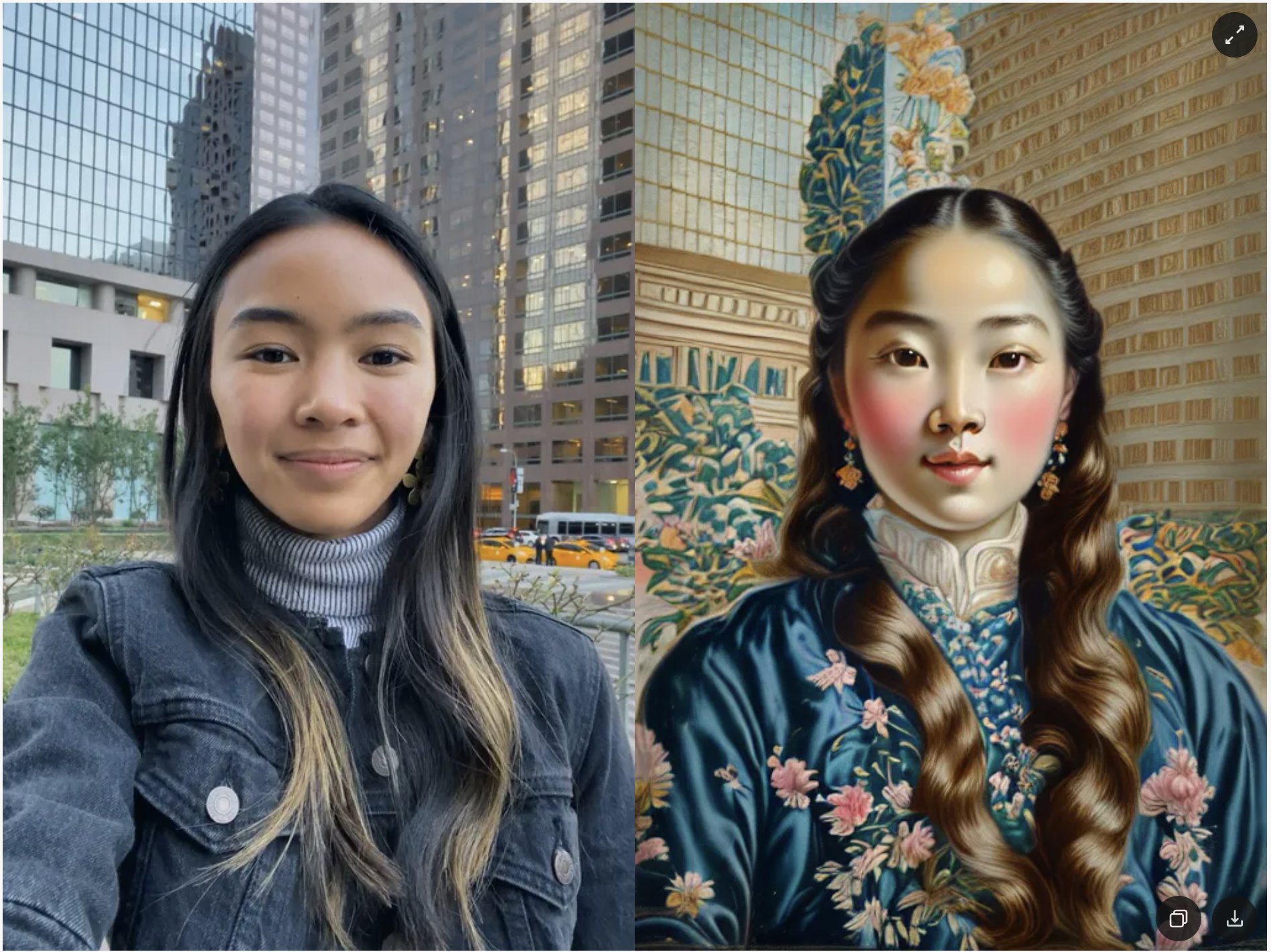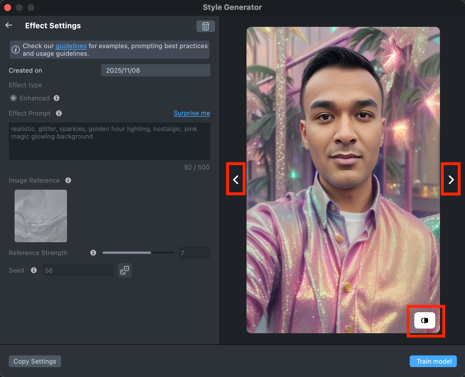 Once the preview has been generated, you can click its tile in the Gallery to open the details page. Here, you can use the arrows on the sides to preview the effect on different models. Additionally, you can click the button in the bottom-right corner to view the original image the effect was applied to.
