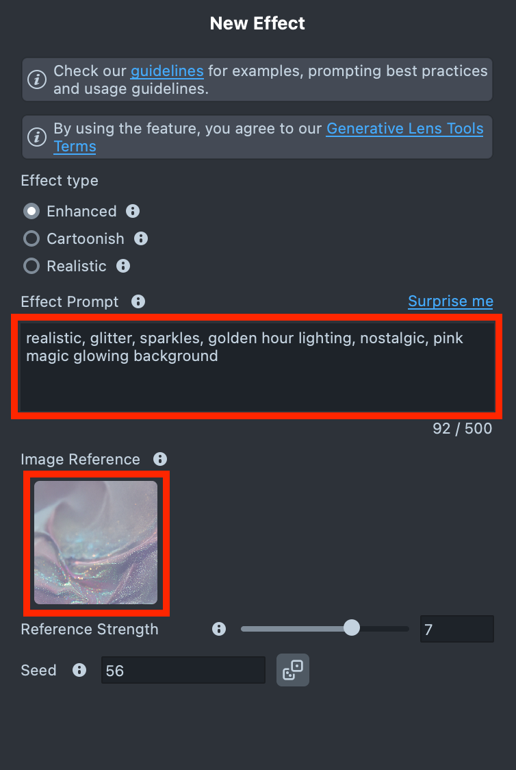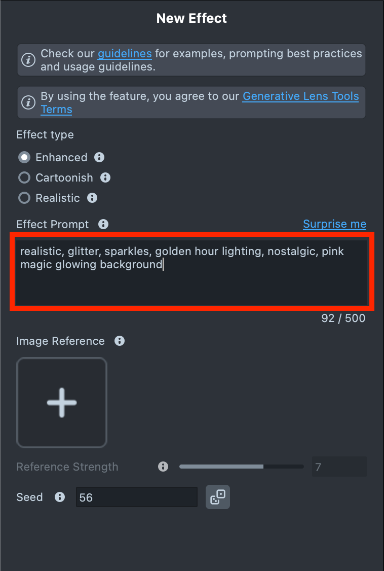 Effect Prompttext field (up to 500 characters).See the Best Practices guide to learn how to achieve the best results.