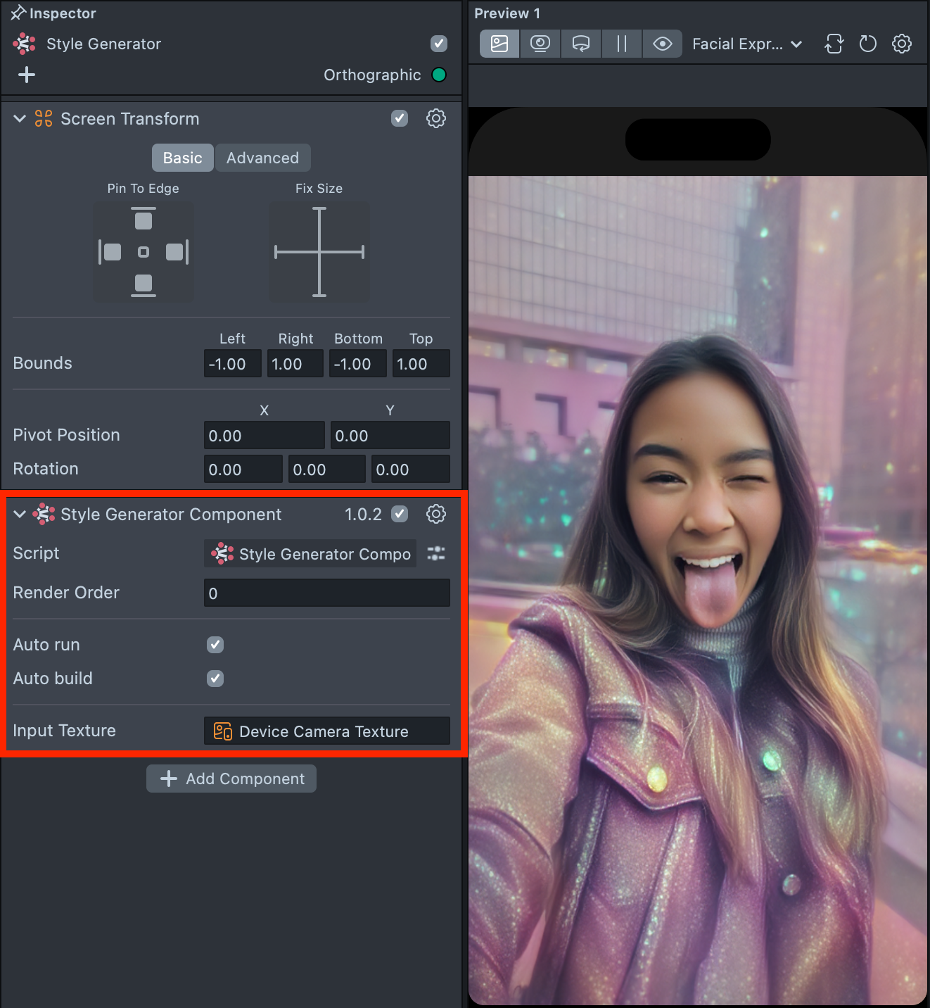 Preview the result in the preview panel and continue building your Lens. When you’re satisfied with the result, save your project and push the Lens for testing on Snapchat. See the Pairing to Snapchat guide to test your Lens on a device, and the Publishing guide to learn more about sharing your creation.