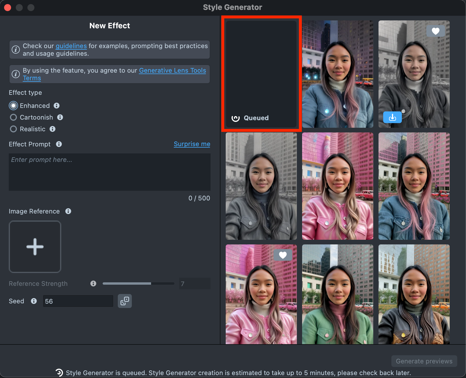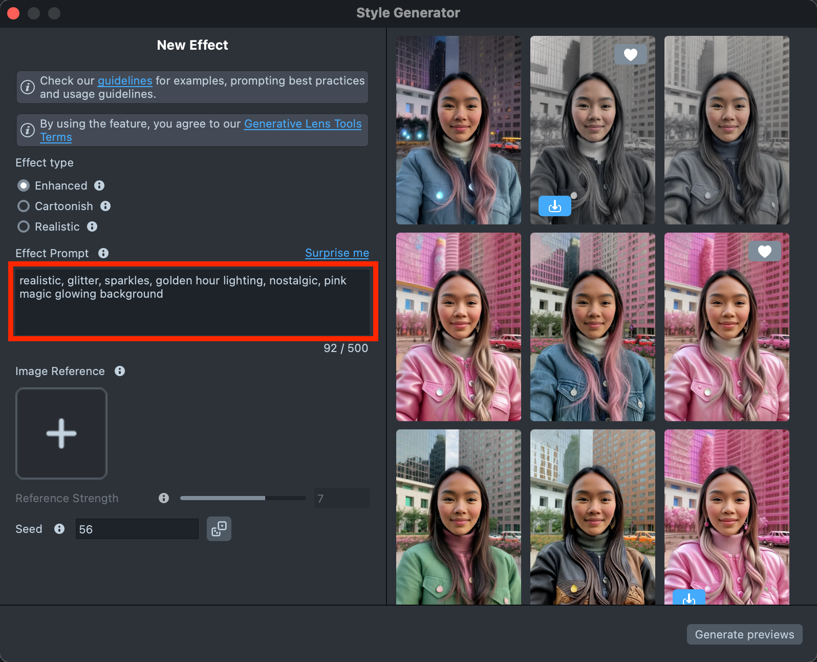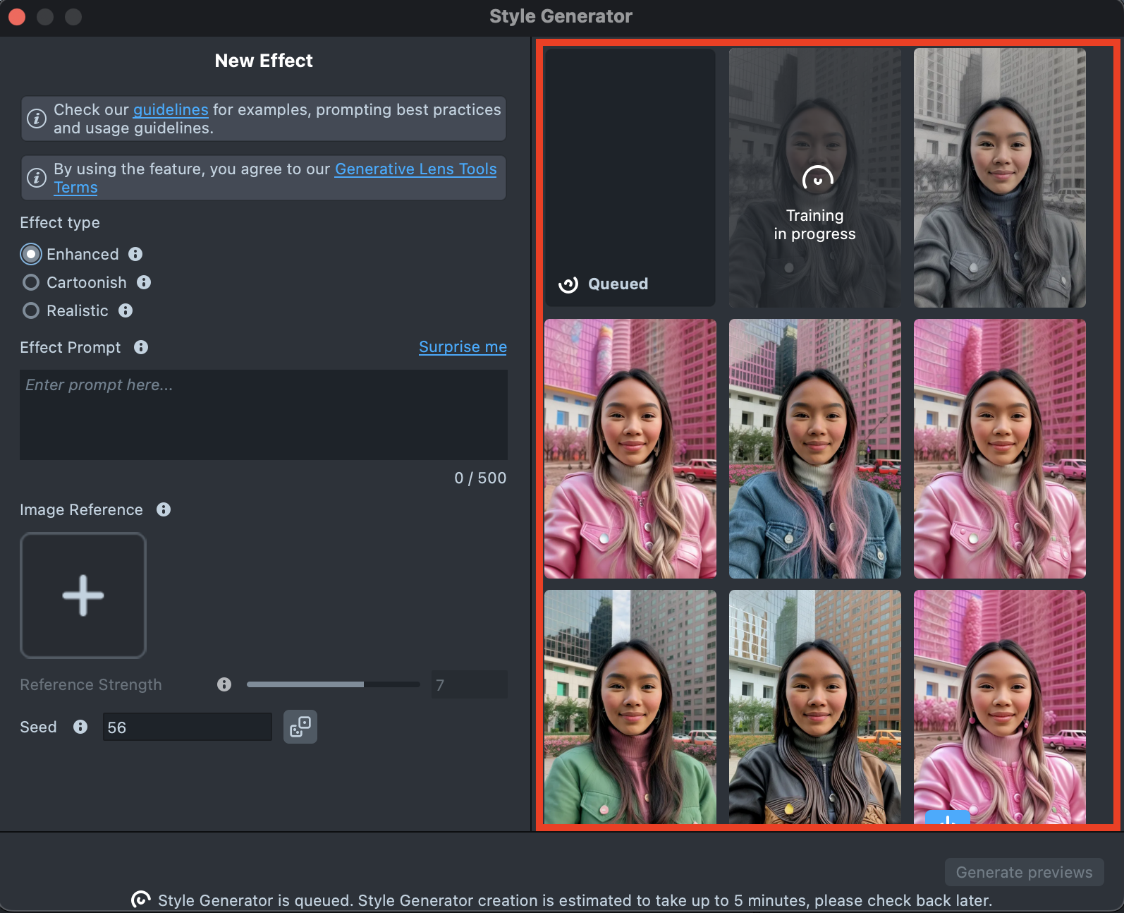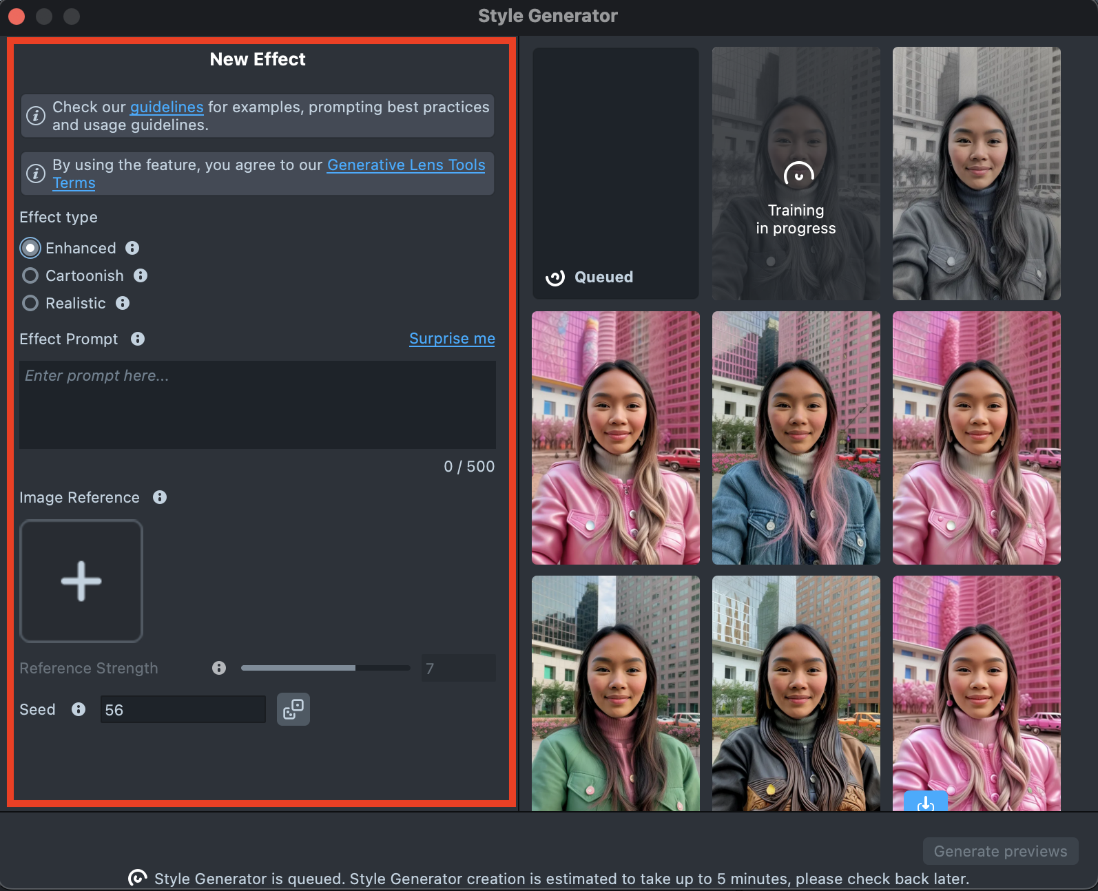 Overall, the effect creation process is the same across all effect types. The main difference is that Enhanced offers additional settings and supports using Effect Prompt and Image Reference together, while Cartoonish, for example, allows only one input type at a time - either a Text prompt or an Image prompt.