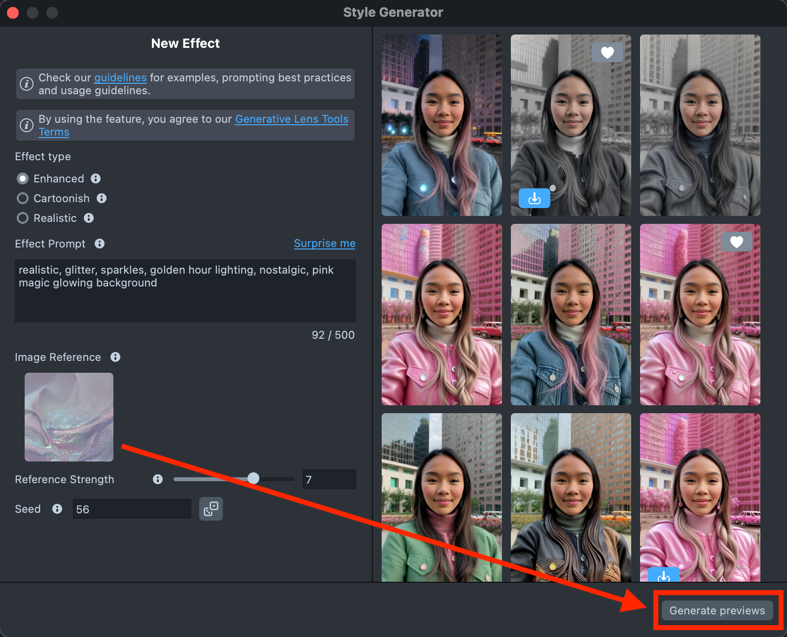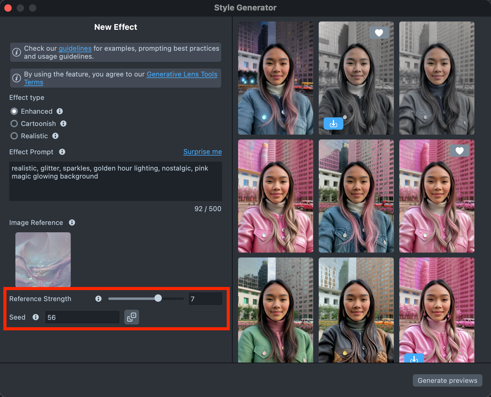 - Reference strength - Controls how strongly the effect follows the Image Reference. A higher value makes the result closer to the Image Reference, but reduces similarity to the original user photo.