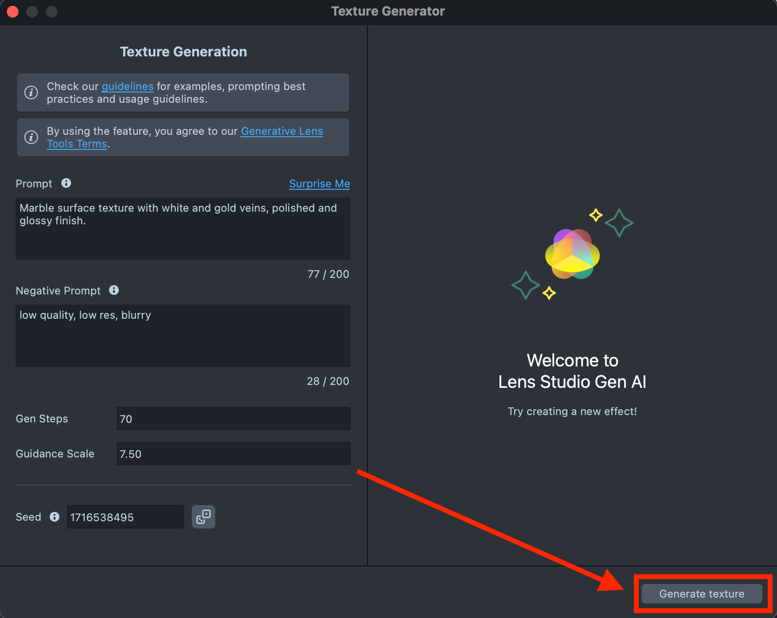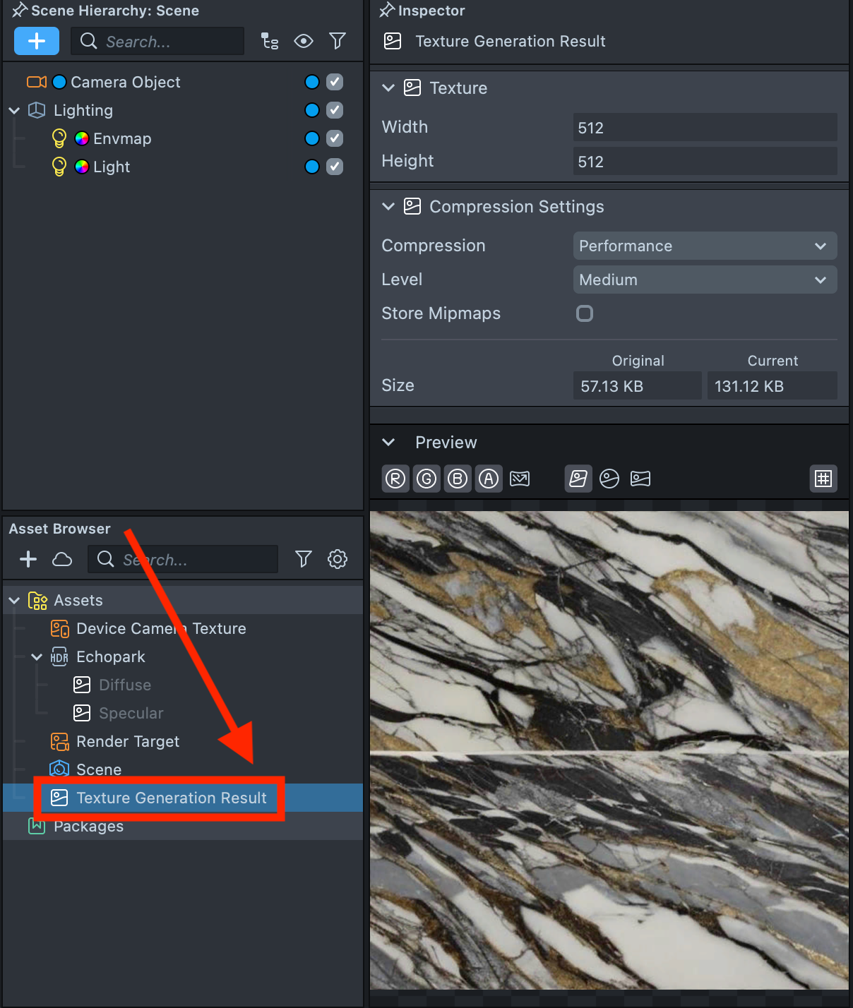 The generated texture will appear in the Asset Browser under the name Texture Generation Result. Once you’ve finished building your Lens, save your project and push the Lens for testing on Snapchat. See the Pairing to Snapchat guide to test your Lens on a device, and the Publishing guide to learn more about sharing your creation.