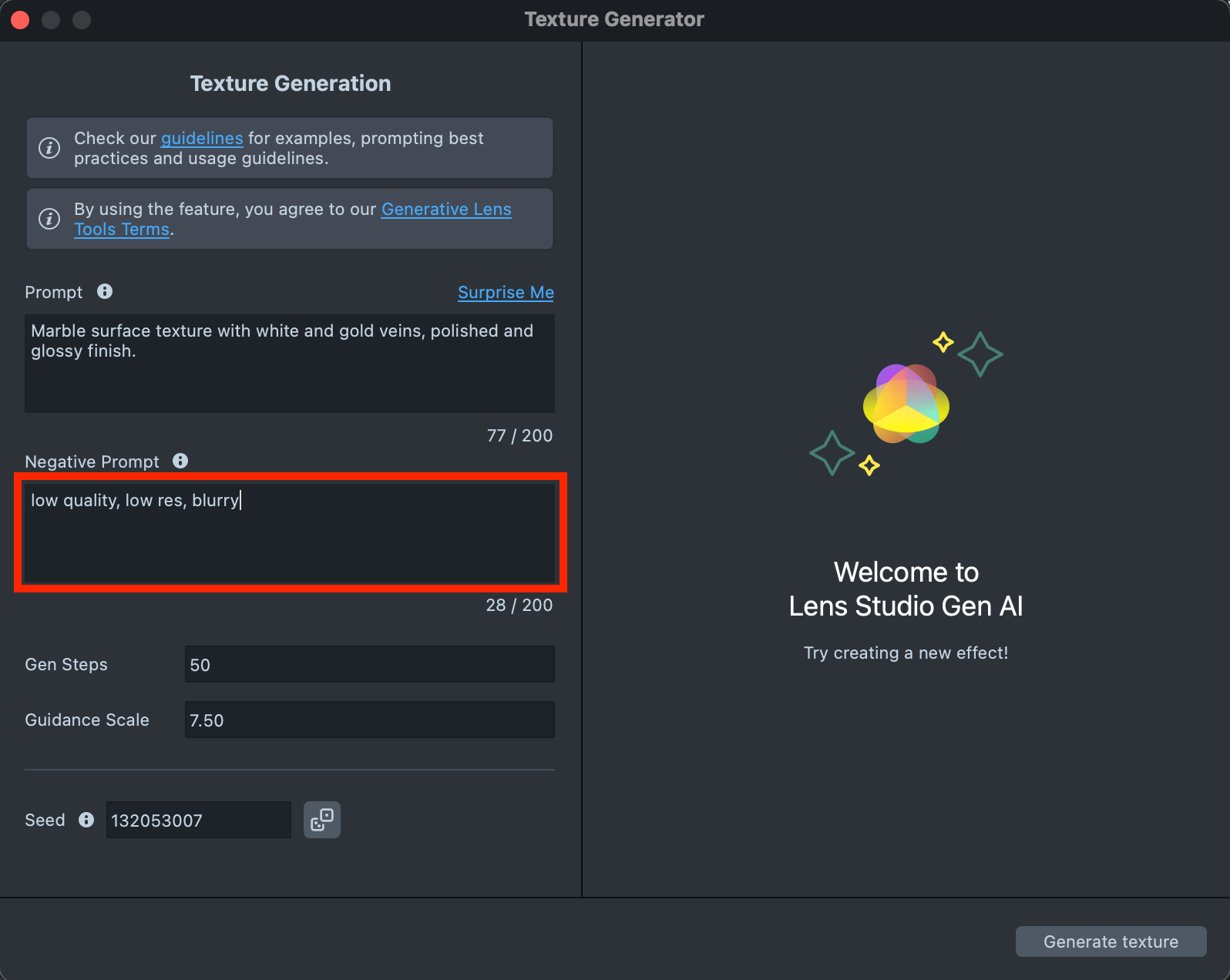 The Negative Prompt field is optional and allows you to list elements you don’t want to appear on your texture. This can include both visual aspects (such as specific colors, shapes, or styles) and texture-quality issues you’d like to avoid.