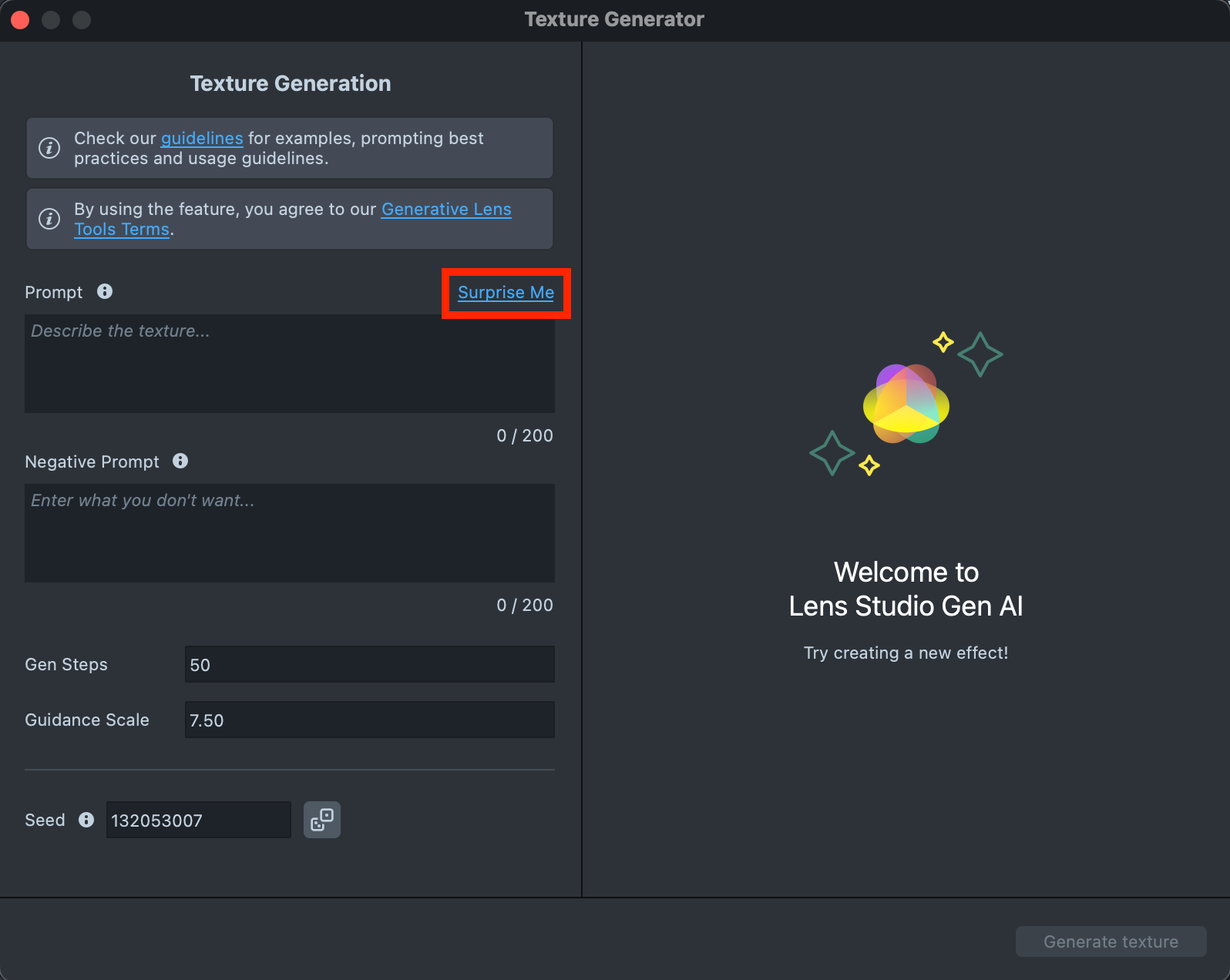If you are ready to use your own prompt, enter a description of the texture you’d like to generate in the